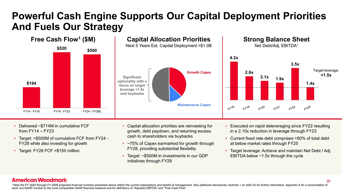 强大的现金引擎支持我们的资本部署优先事项,并推动我们的战略1自由现金流(百万美元)资本分配优先事项强劲的资产负债表1未来5年东部时间。资本部署> $ 1.0b净债务/Adj. EBITDA $ 520 $ 500 4.2x 3.5x目标杠杆:增长资本支出2.6x < 1.5x显着2.1x 1.9x可选项,194美元1.4倍关注目标杠杆< 1.5x和回购维持资本支出FY14-FY18 FY19-FY23 FY24-FY28E •交付了约7.14亿美元的累计FCF •资本配置优先事项正在进行再投资,用于•自22财年以来因FY14 – FY23增长、债务偿还导致的快速去杠杆化而执行,并通过回购将23财年的现金以2.10倍的杠杆率降低的超额收益返还给股东•目标:从24财年起累计FCF > 5亿美元-•当前的固定利率债务占28财年总债务的比例超过50%,同时还为增长进行投资•到25财年至28财年,约75%的资本支出指定用于以低于市场的利率实现增长,提供巨大的灵活性•目标:28财年FCF > 1.5亿美元•目标杠杆率:实现并保持净债务/Adj. •目标:通过到28财年的周期举措,在我们的GDP EBITDA低于~1.5倍的情况下进行约5亿美元的投资301请注意,上述2024财年至2028财年的预计财务数字反映了管理层当前的预期和信念。有关更多信息,请参见更多披露,幻灯片33上的脚注1,附录A,用于每个非GAAP数字与最具可比性的GAAP财务指标的对账,以及“调整后EBITDA”和“自由现金流”的定义。