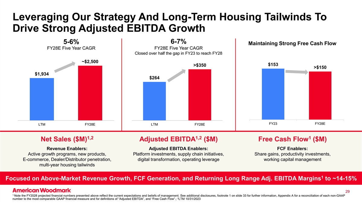 利用我们的战略和长期住房顺风推动强劲的调整后EBITDA增长6-7 % 5-6 %保持强劲的自由现金流FY28E五年复合年增长率FY28E五年复合年增长率在23财年缩小了一半以上的差距,达到FY28~$ 2,500 $ 153 > $ 350 > $ 150 $ 1,934 $ 264 FY23 FY28E LTM FY28E LTM FY28E 1,21,21净销售额(百万美元)调整后EBITDA(百万美元)自由现金流(百万美元)收入促成因素:调整后EBITDA促成因素:FCF促成因素:积极的增长计划、新产品、平台投资、供应链举措、份额收益、生产力投资、电子商务、经销商/分销商渗透、数字化转型,经营杠杆营运资本管理多年住房顺风1关注高于市场的收入增长、FCF生成以及长期调整后的EBITDA利润率恢复至~14-15 % 291请注意,上述2028财年预计财务数据反映了管理层当前的预期和信念。有关更多信息,请参见更多披露,幻灯片33上的脚注1,附录A,介绍每个非GAAP 2数字与最具可比性的GAAP财务指标的对账,以及“调整后EBITDA”和“自由现金流”的定义。;LTM 10/31/2023