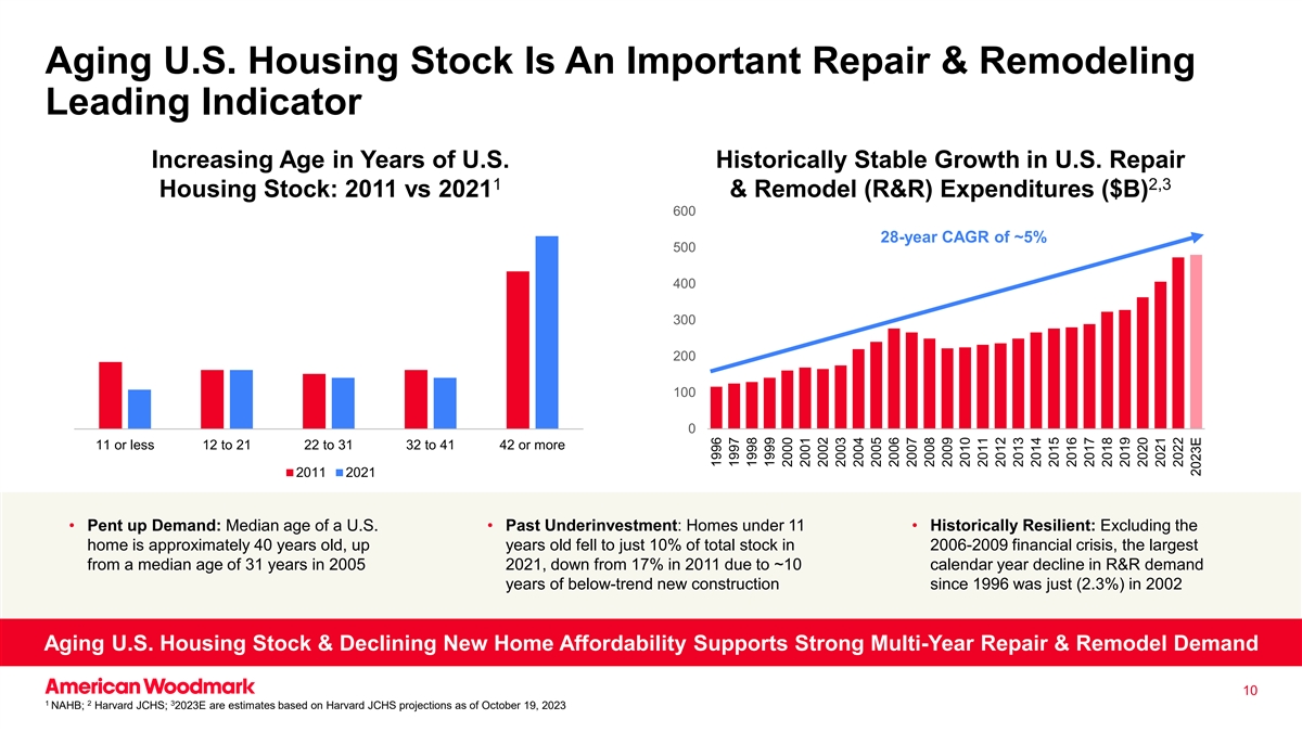 美国住房存量老化是重要的修复&重塑领先指标美国历年来的年龄增长美国历史上稳定增长修复12,3住房存量:2011年vs 2021年& Remodel(R & R)支出($ B)60028年复合年增长率~5% 500400300200100011或更少12至2122至3132至4142或更多20112021 •被压抑的需求:美国的中位年龄•过去投资不足:11岁以下的住房•历史上具有韧性:不包括大约40岁的住房,最高年龄在2006-2009年金融危机中降至仅占总存量的10%,与2005年31岁的中位年龄相比是最大的2021年,低于2011年的17%,原因是R & R需求下降约10个日历年,自1996年以来低于趋势的新建筑年份在2002年刚刚(2.3%)。美国住房存量老化和新房可负担性下降支持强劲的多年维修和改造需求10123 NAHB;哈佛JCHS;2023E是基于哈佛JCHS截至10月19日的预测的估计,20231996199719981999200020012002200320042005200620072008200920102011201220132014201520162017201820192020202120222023E
