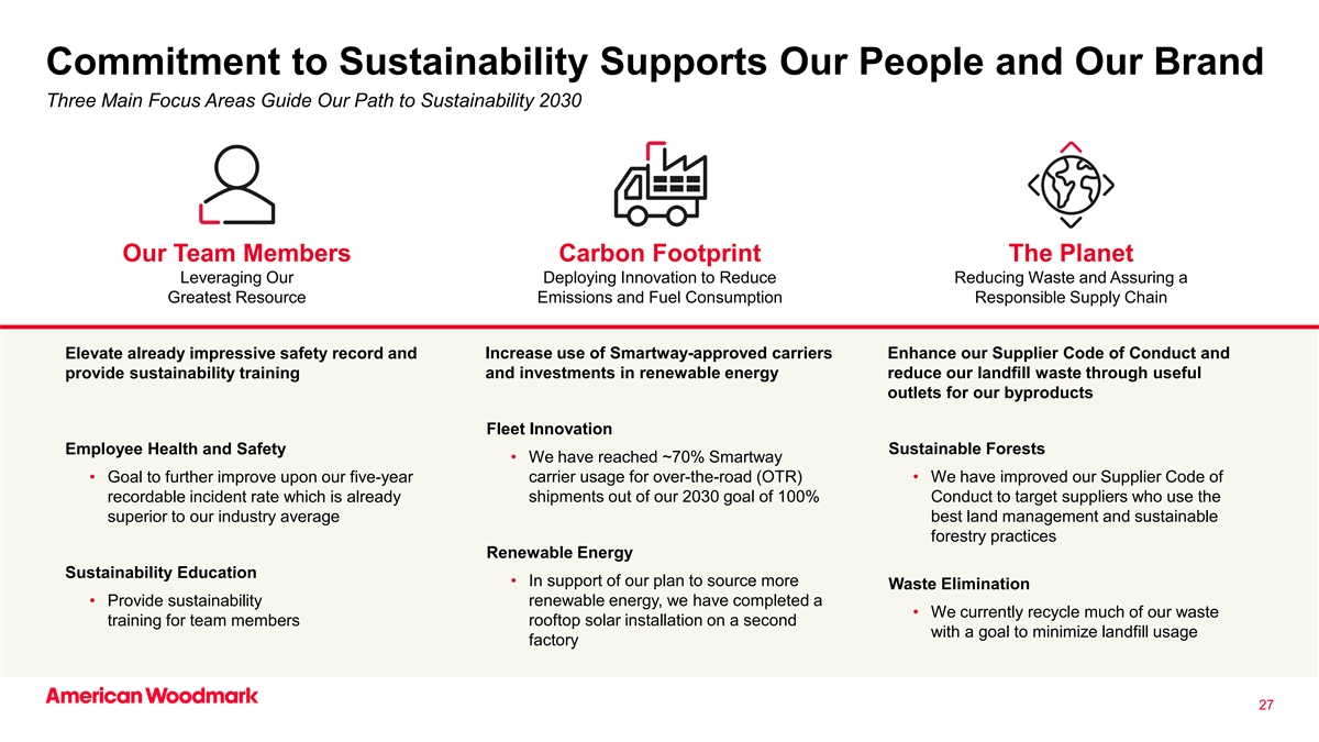 对可持续发展的承诺支持我们的员工和我们的品牌三个主要关注领域指导我们的可持续发展之路2030我们的团队成员碳足迹这个星球利用我们的部署创新来减少浪费,并确保最大的资源排放和燃料消耗负责任的供应链提升了已经令人印象深刻的安全记录,并增加了对智能道路批准的载体的使用,从而增强了我们的供应商行为准则,并提供可持续发展培训和对可再生能源的投资,通过我们的副产品有用的出口减少我们的垃圾填埋场废物车队创新员工健康和安全可持续森林•我们已达到~70%的Smartway •目标是进一步改进我们五年的公路(OTR)载体使用情况•我们已改进可记录事故率的供应商代码,这已经超出了我们2030年100%的目标,即向使用优于我们行业平均最佳土地管理和可持续林业做法的目标供应商进行可持续发展的目标供应商提供可记录事故率的100%可持续发展教育•支持我们采购更多废物消除的计划•提供可持续的可再生能源,我们已经完成了一项•我们目前为团队成员的屋顶太阳能安装在一秒钟内回收我们的大部分废物培训,目标是尽量减少垃圾填埋场的使用工厂27