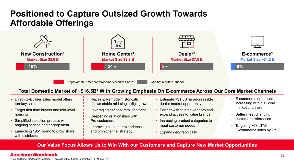 定位于捕捉向可负担得起的产品的巨大增长1111新建筑家居中心经销商电子商务市场规模$ 5.8B市场规模$ 3.2B市场规模$ 7.5B市场规模~$ 1.2B 24% 15% 2% 9% 2大约伍德马克市场份额橱柜市场渠道1国内市场总额约为$ 16.5b随着我们核心市场渠道对电子商务的日益重视1 •电子商务机会•直接面向建筑商的销售模式优惠•历史上的修复和改造•估计所有核心统包解决方案内的可寻址增量约为$ 1.5b显示稳定的中个位数增长经销商市场机会市场渠道•目标优先时间买家和中层•利用全国零售足迹•与值得信赖的供应商和住房合作,扩大获得价值品牌的机会•更好地满足变化•加深与客户偏好的关系•简化与Pro客户的选择流程•将产品类别增加到2个持续服务和参与满足客户需求•目标约为2倍LTM •到28财年改善客户体验电子商务销售•推出1951品牌以增加份额和全渠道战略•与分销商进行地域扩张我们的价值重点使我们能够与客户一起赢得胜利并捕捉新的市场机会231232更多信息请参见幻灯片33上的更多披露,脚注。LTM 10/31/23。