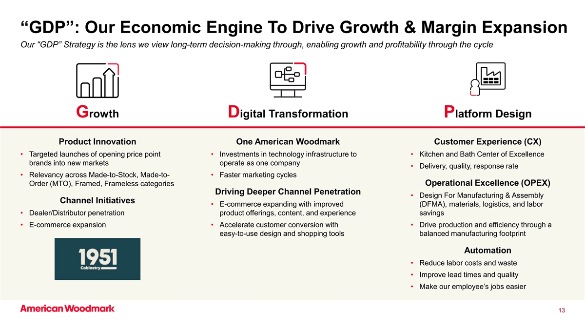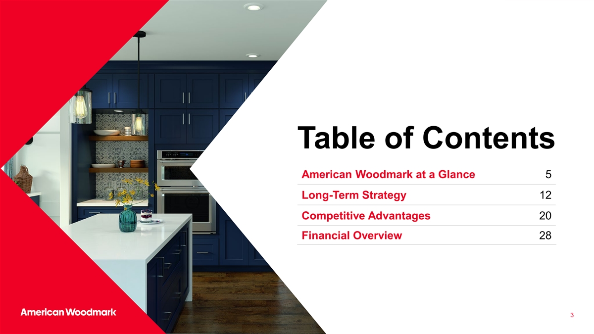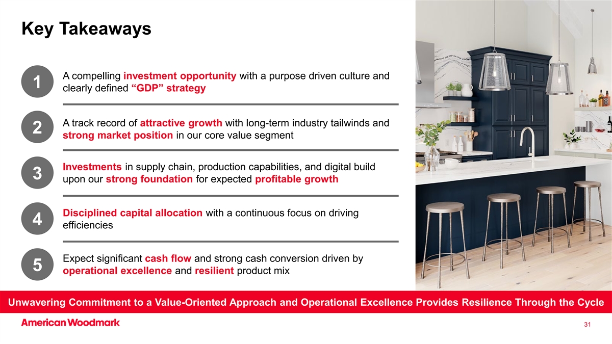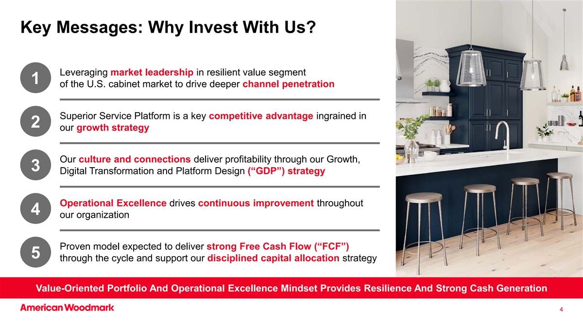 关键信息:为什么要和我们一起投资?利用美国橱柜市场1的弹性价值细分市场的市场领先地位,推动更深层次的渠道渗透卓越的服务平台是2我们增长战略中根深蒂固的关键竞争优势我们的文化和人脉通过我们的增长带来盈利能力,3数字化转型和平台设计(“GDP”)战略卓越运营推动整个组织的持续改善4我们的组织经过验证的模式有望在整个周期中提供强劲的自由现金流(“FCF”)5,并支持我们严格的资本配置战略以价值为导向的投资组合和卓越运营心态提供了韧性和强大的现金生成4