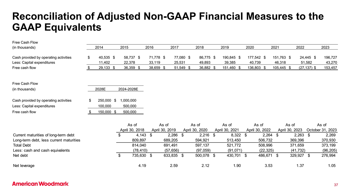 调整后的非公认会计原则财务指标与公认会计原则等价物自由现金流的对账(千)2014201520162017201820192020202120222023经营活动提供的现金40,535美元58,737美元71,778美元77,080美元86,775美元190,845美元177,542美元151,763美元24,445美元196,727减:资本支出11,40222,37833,11925,53149,89339,38540,73946,31851,58243,270自由现金流29,133美元36,359美元38,659美元51,549美元36,882美元151,460美元136,803美元105,445美元(27,137)153,457美元自由现金流(千)2028E 2024-2028E经营活动提供的1,000,000美元减:资本支出100,000500,000自由现金流150,000500,000美元截至截至2018年4月30日2019年4月30日2020年4月30日2021年4月30日2022年4月30日2023年10月31日当前到期长期债务4,143美元2,286美元2,216美元8,322美元2,264美元2,263美元2,269美元长期债务,减当前到期日809,897689,205594,921513,450506,732369,396370,930总债务814,040691,491597,137521,772508,996371,659373,199减:现金及现金等价物(78,410)(57,656)(97,059)(91,071)(22,325)(41,732)(96,205)净债务735,633,835美元500,078美元430,701美元486,671美元329,927美元276,994净杠杆4.19 2.59 2.12 1.90 3.53 1.37 1.05 37