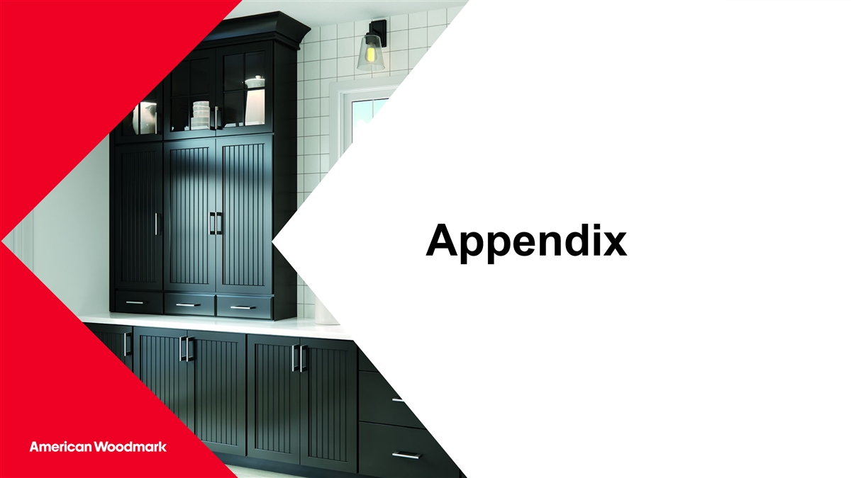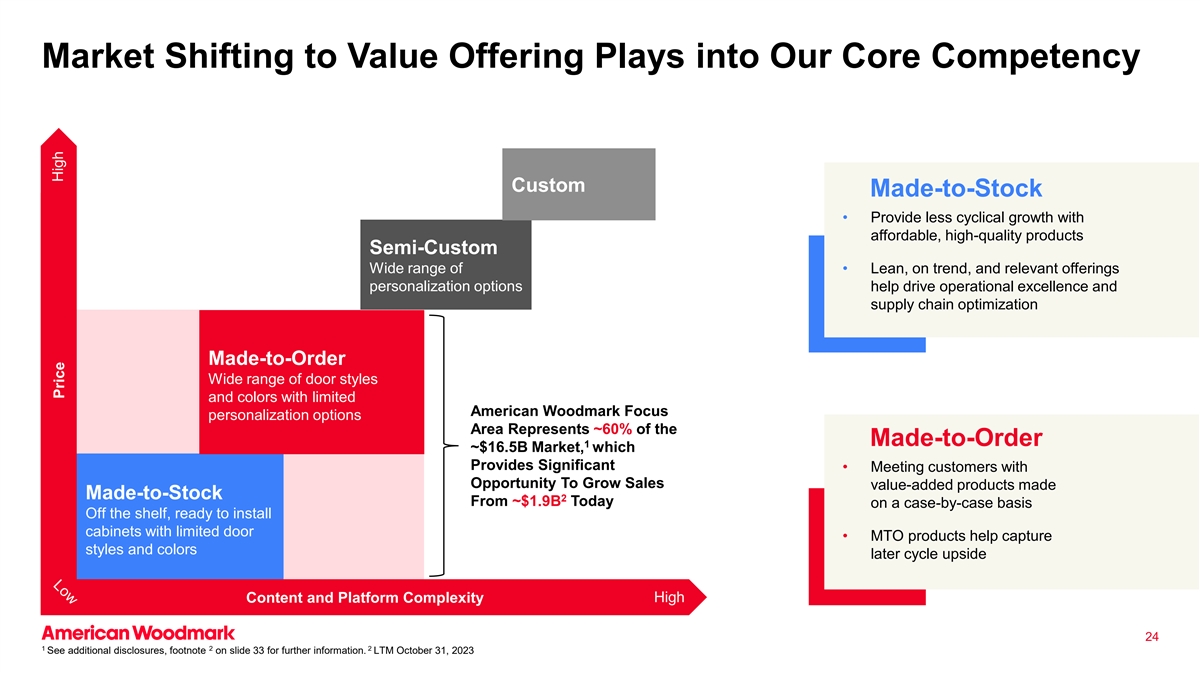 市场转向价值提供发挥我们的核心竞争力定制库存•以价格实惠的高质量产品提供较少周期性的增长半定制范围广泛•精益、顺势而为和相关产品的个性化选项有助于推动卓越运营和供应链优化定制范围广泛的门样式和颜色以及有限的伍德马克焦点个性化选项区域代表了定制1~$ 16.5B市场的~60%,这为重要的•满足客户提供了机会,让他们有机会在现成的基础上从~$ 1.9B增长销售增值产品今天,准备安装门限的橱柜• MTO产品有助于捕捉风格和颜色后周期上行内容和平台复杂性高24122更多信息请参见更多披露,幻灯片33上的脚注。LTM 2023年10月31日高价