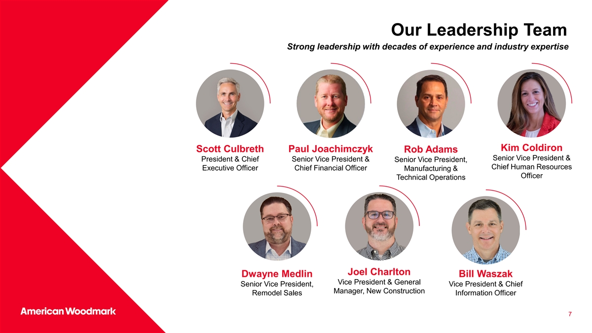 我们以目标为驱动的文化维持我们的竞争优势使命愿景价值观通过人创造价值:揭示并庆祝我们的CITE原则:每一个中的独特潜力•提供厨房和浴室•客户满意个人:为美国家庭感到自豪•诚信•社区联系•奖励股东和我们•团队合作的员工•客户体验•卓越•为我们的社会做出贡献•相互关联的个人•颠覆性创新•系统思维我们的社区、员工、设计师和客户激发我们的文化并使我们与众不同6