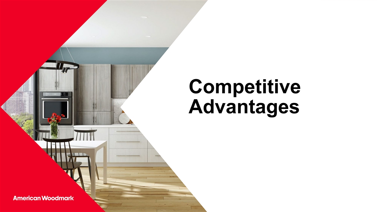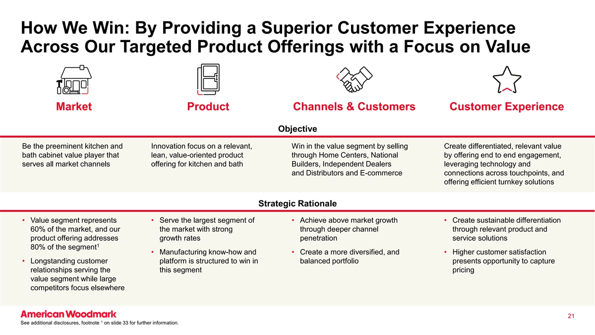 我们如何取胜:通过在我们的目标产品中提供卓越的客户体验,重点关注价值市场产品渠道&客户客户体验目标成为卓越的厨房和创新重点,通过销售在价值细分市场中取胜,创造差异化、相关的价值浴柜价值玩家,通过家庭中心精益、价值导向的产品,通过提供端到端参与的全国范围内,服务于所有市场渠道,为厨房和浴室建造者提供服务,独立经销商利用技术和分销商以及跨接触点的电子商务连接,和提供高效的统包解决方案的战略理由•价值细分市场代表•服务于最大的细分市场•实现高于市场的增长•创造可持续的差异化60%的市场,我们的市场通过相关产品和产品提供的更深渠道解决了增长率渗透服务解决方案180%的细分市场•制造诀窍和•创造更多样化的,和•更高的客户满意度•长期客户平台的结构旨在在平衡的投资组合中取胜,这提供了抓住服务于该细分市场定价价值细分市场的关系的机会,而大型竞争对手则专注于其他领域211更多信息,请参见更多披露,幻灯片33的脚注。