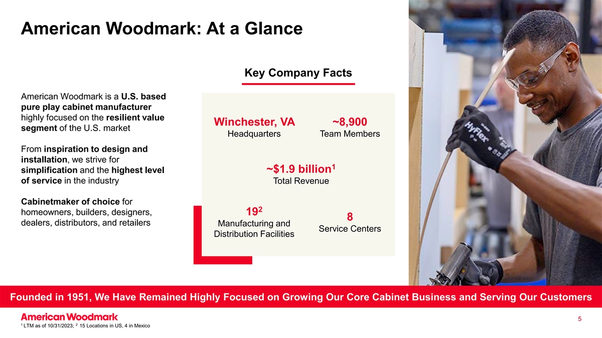 伍德马克:一览关键公司事实丨伍德马克是一家总部位于美国的纯游戏柜制造商,高度专注于具有韧性的价值Winchester,VA~8900细分美国市场总部团队成员从灵感到设计安装,我们力求10~19亿美元的简化和行业最高水平的服务总收入橱柜制造商2位房主、建筑商、设计师、198位经销商、分销商和零售商的首选制造和服务中心配送设施成立于1951年,我们一直高度专注于发展我们的核心橱柜业务和服务我们的客户512 LTM截至2023年10月31日;美国15个地点,墨西哥4个