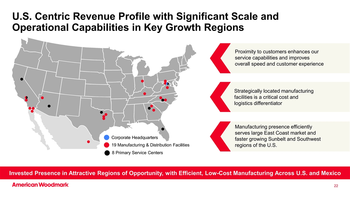 以美国为中心的收入概况,在关键增长区域具有显着的规模和运营能力靠近客户可增强我们的服务能力,提高整体速度和客户体验战略位置的制造设施是关键的成本和物流差异化因素制造存在有效地服务于大型东海岸市场和公司总部增长更快的阳光地带和美国西南19个制造和分销设施区域8个主要服务中心投资于有吸引力的机会区域,在美国和墨西哥拥有高效、低成本的制造22