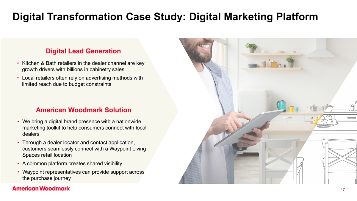 数字化转型:客户体验和效率驱动通过利用数字能力加强我们的竞争优势和盈利能力,通过增加以消费者为中心的方式解锁效率One 伍德马克数字营销方法•企业资源规划和客户•通过强大的数字关系管理系统扩大参与度,帮助营销活动实现效率收益•适应在线消费者偏好•更好地利用整个信息•潜在客户生成电子商务工具组织以扩大业务范围•统一产品和单一下的能力•投资经销商/分销商线上平台,以平台改善客户体验(CX)•精细的数据分析,跟踪客户生命周期和服务需求•更好地跨团队调整内部能力16