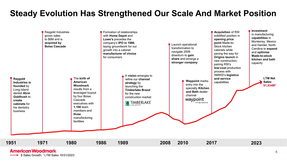 稳步发展加强了我们的规模和市场地位投资Raygold Industries形成关系收购制造业的RSI使销售额与家得宝增长,并巩固了能力地位,达到600万美元,是Lowe公司在1986年IPO收购的墨西哥蒙特雷的开盘价,点Made-to-Launch Operation和哈姆雷特,North Boise Cascade为我们对Carolina的存量厨房改造奠定基础在导航2008的同时将增长扩展为橱柜橱柜并优化为低迷铺平道路的首选制造商以获得为消费者原产地推出的存量份额并出现厨卫新建筑;更强的公司能力将RSI的低成本生产工艺与AMWD的物流相结合LTM Net的诞生出现了一个愿景和服务Raygold完善我们的渠道Waypoint marks American Sales:capabilities Industries is strategy by entry into the 1 Woodmark $ 19.34亿founded by launching the specialty Kitchen results from a Long Island Timberlake brand and Bath dealer leveraged buyout dentist Alvin for the new channel by four Boise Goldhush to construction market Cascade creates executives with cabinets for 1,100 team his dentistry members and business three manufacturing f