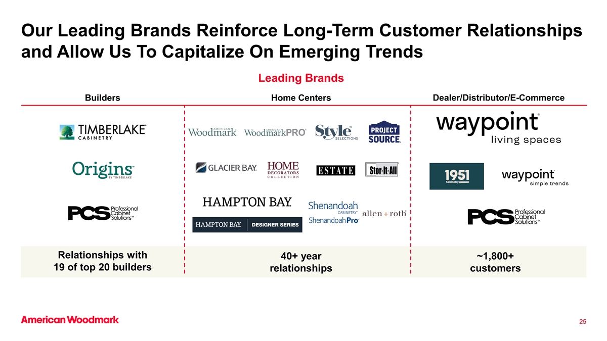 我们的领先品牌加强了长期客户关系,使我们能够利用新兴趋势领先品牌与40 +年~1800 + 19的前20名建筑商关系客户建立家庭中心经销商/分销商/电子商务关系25