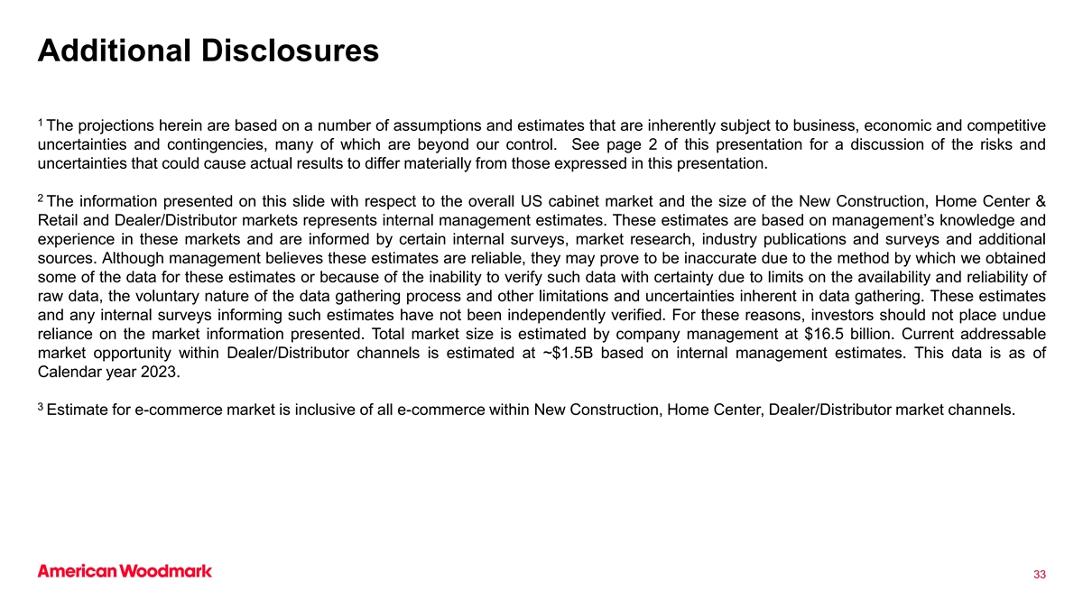 附加披露1本文的预测基于一些假设和估计,这些假设和估计本质上受到商业、经济和竞争不确定性和意外事件的影响,其中许多超出了我们的控制范围。有关可能导致实际结果与本演示文稿中表达的结果存在重大差异的风险和不确定性的讨论,请参阅本演示文稿的第2页。2这张幻灯片上提供的有关美国整体橱柜市场以及新建筑、家居中心和零售以及经销商/分销商市场规模的信息代表内部管理层的估计。这些估计是基于管理层在这些市场的知识和经验,并由某些内部调查、市场研究、行业出版物和调查以及其他来源提供信息。尽管管理层认为这些估计是可靠的,但由于我们获得这些估计的一些数据的方法,或者由于原始数据的可用性和可靠性受到限制、数据收集过程的自愿性质以及数据收集中固有的其他限制和不确定性,无法确定地核实这些数据,这些估计可能被证明是不准确的。这些估计数和告知这些估计数的任何内部调查都没有得到独立核实。基于这些原因,投资者不应过分依赖所呈现的市场信息。公司管理层估计市场总规模为165亿美元。根据内部管理层的估计,经销商/分销商渠道内目前可寻址的市场机会估计约为1.5B美元。这一数据截至2023日历年。3对电商市场的估计是包含新建、家居中心、经销商/经销商市场渠道内的所有电商。33