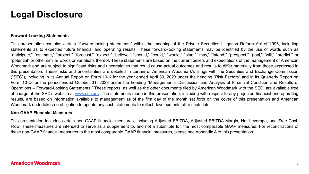 法律披露前瞻性陈述本演示文稿包含1995年《私人证券诉讼改革法案》含义内的某些“前瞻性陈述”,包括关于预期未来财务和经营业绩的陈述。这些前瞻性陈述可以通过使用“预期”、“估计”、“项目”、“预测”、“预期”、“相信”、“应该”、“可能”、“将”、“计划”、“可能”、“打算”、“前景”、“目标”、“将”、“预测”或“潜在”等词语或其他类似词语或变体来识别。这些陈述基于伍德马克管理层当前的信念和期望,并受到重大风险和不确定性的影响,这些风险和不确定性可能导致实际结果和结果与本演示文稿中表达的结果和结果存在重大差异。这些风险和不确定性在伍德马克提交给美国证券交易委员会(“SEC”)的某些文件中有详细说明,包括其截至2023年4月30日止年度“风险因素”标题下的10-K表格年度报告以及截至2023年10月31日止期间“管理层对财务状况和经营业绩的讨论和分析——前瞻性陈述”标题下的10-Q表格季度报告。这些报告,以及伍德马克向SEC提交的其他文件,均可在SEC网站www.sec.gov上免费查阅。本演示文稿中所做的报表,包括与任何预计财务和经营业绩相关的报表,均基于截至本演示文稿封面所载每月第一天管理层可获得的信息,伍德马克不承担更新任何此类报表以反映该日期之后的事态发展的义务。非GAAP财务指标本演示文稿包括某些非GAAP财务指标,包括调整后EBITDA、调整后EBITDA利润率、净杠杆和自由现金流。这些措施旨在作为最具可比性的GAAP措施的补充,而不是替代。有关这些非GAAP财务指标与最具可比性的GAAP财务指标的对账,请参阅本演示文稿的附录A。2
