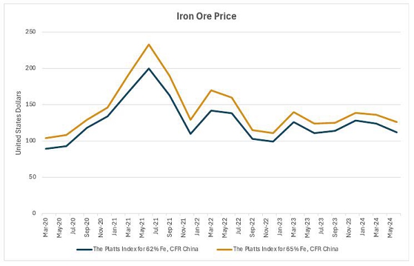 Fe含量为65%的铁矿石,例如Scully铁矿的产品,由于其优越的质量,通常比62%的Fe铁矿石要溢价。2024年上半年,普氏65% FE指数以约11%的溢价(13美元)交易,平均价格为每吨131美元,而普氏62% FE指数为每吨118美元。