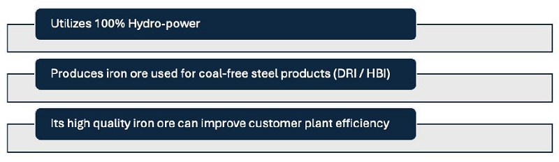 Scully铁矿生产的优质矿石含铁量超过65%,具有良好的特性,包括二氧化硅、氧化铝和磷等污染物含量较低。这种杂质极少的高品位铁矿石受到全球钢铁制造商的高度重视,因为它通过更有效的原材料利用、更高的工厂产量和更低的排放来提高环境和财务绩效。因此,Scully矿的优质精矿在支持全球转向“绿色”钢铁生产方面发挥着至关重要的作用。该矿地理位置优越,可以满足这种不断增长的需求,原因之一是:
