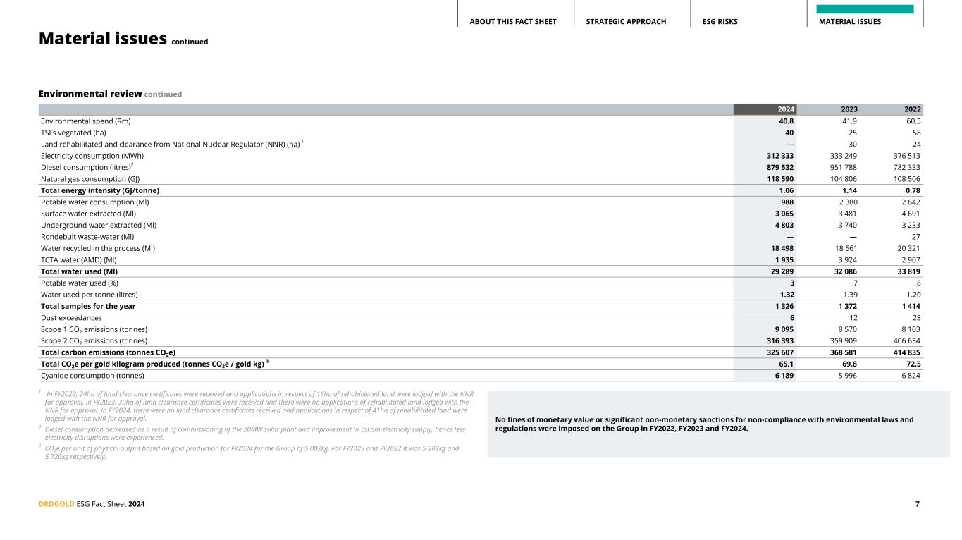 环境审查持续202420232022环境支出(RM)40.84 1.96 0.3TSFs植被(ha)402558土地修复国家核监管机构(NNR)(ha)1 — 3024电力消耗(MWh)3123333333249376513柴油消耗(升)2879532951788782333天然气消耗(GJ)118590104806108506总能源强度(GJ/tonne)1.06 1.14 0.78饮用水消耗(ML)98823802642提取的地表水(ML)306534814691提取的地下水(ML)480337403233 Rondebult废水(ML)—— 27过程中循环利用的水(ML)184981856120321 TCTA水(AMD)(ML)193539242907总用水量(ML)292893208633819总用水量(%)378每吨用水量(升)1.32 1.39 1.20总样本年度132613721414粉尘超标61228范围1 CO2排放量(吨)909585708103范围2 CO2排放量(吨)316393359909406634碳排放总量(吨CO2e)325607368581414835每生产一金千克的总CO2e(吨CO2e/金千克)365.16 9.87 2.5氰化物消费量(吨)6189599668241在2022财年,收到了24公顷的土地清理证书,并向NNR16公顷的修复土地提出了批准申请。2023财年,收到了30公顷的土地清理证书,并且没有向NNR提交批准的修复土地申请。2024财年,没有收到任何土地清理证书,41公顷修复土地的申请已向NNRR提交以供批准。2由于20MW太阳能发电厂投产和Eskom电力供应改善,柴油消耗减少,因此电力中断减少。集团2024财年基于黄金产量的单位实物产量3 CO2e为5002kg。2023财年和2022财年分别为5,282kg和5,720kg。本集团于2022财年、2023财年及2024财年未因不遵守环境法律法规而被处以金额罚款或重大非金钱制裁。关于本概况介绍战略方法ESG风险重大问题重大问题续DRDGOLD ESG概况介绍20247