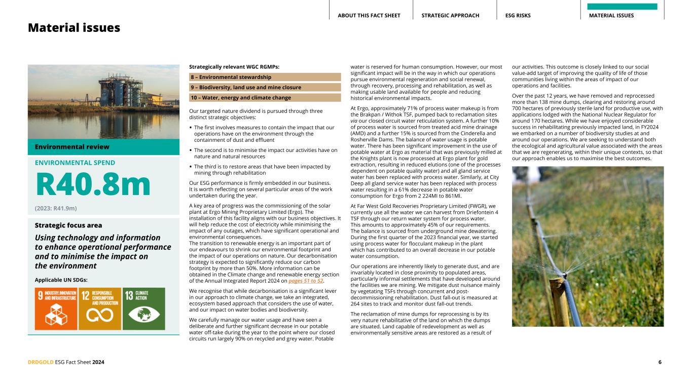 环境审查环境支出R40.8m(2023:R41.9m)战略重点领域利用技术和信息提高运营绩效并最大限度地减少对环境的影响适用的联合国可持续发展目标:战略相关的WGC RGMP:8 –环境管理9 –生物多样性、土地使用和矿山关闭10 –水,能源和气候变化我们通过三个不同的战略目标来追求有针对性的自然红利:•第一个目标涉及采取措施,通过遏制粉尘和废水来遏制我们的运营对环境的影响•第二个目标是尽量减少我们的活动对自然和自然资源的影响•第三个目标是通过修复恢复受到采矿影响的区域,我们的ESG绩效牢牢嵌入我们的业务中。值得反思的是,年内开展工作的几个特定领域。进展的一个关键领域是Ergo Mining Proprietary Limited(Ergo)太阳能工厂的投产。该设施的安装符合我们的业务目标。这将有助于降低电力成本,同时最大限度地减少任何停电的影响,这些停电会对运营和环境产生重大影响。向可再生能源的过渡是我们努力缩小环境足迹以及我们的运营对自然的影响的重要组成部分。我们的脱碳战略预计将使我们的碳足迹大幅减少50%以上。更多信息可在第51至52页的《2024年年度综合报告》的气候变化和可再生能源部分获得。我们认识到,虽然脱碳是我们应对气候变化方法的一个重要杠杆,但我们采取了一种综合的、基于生态系统的方法,其中考虑了水的使用,以及我们对水体和生物多样性的影响。我们谨慎管理我们的用水情况,并看到我们的饮用水承购量在这一年中故意进一步显着下降,以至于我们的闭合电路基本上90%都是在回收和灰水上运行的。饮用水是留给人类食用的。然而,我们最重要的影响将体现在我们的业务追求环境再生和社会更新的方式上,通过恢复、加工和恢复,以及为人们提供可用土地和减少历史环境影响。在Ergo,大约71%的工艺水构成来自Brakpan/Withok TSF,通过我们的闭合回路水网系统被抽回填海场地。另有10%的工艺水来自经过处理的酸性矿山排水(AMD),另有15%来自灰姑娘和罗舍维尔大坝。用水的平衡是饮用水。Ergo的饮用水使用情况有了显着改善,因为以前在Knights工厂碾磨的材料现在在Ergo工厂进行黄金提取处理,导致洗脱减少(依赖于饮用水质量水的过程之一),所有腺体服务水都被工艺水取代。同样,在City Deep,所有腺体服务水都被替换为工艺水,导致Ergo的饮用水消耗量从2 224MI减少到861ml,减少了61%。在Far West Gold Recoveries Proprietary Limited(FWGR),我们目前将通过我们的回水系统从Driefontein 4 TSF中收获的所有水用于工艺用水。这相当于我们要求的大约45%。余额来自地下矿山脱水。在2023财年第一季度,我们开始在工厂使用工艺水进行絮凝剂化妆,这导致我们的饮用水消耗量总体下降。我们的业务本质上很可能会产生粉尘,并且总是位于人口稠密地区附近,特别是在我们正在开采的设施周围发展起来的非正式定居点。我们主要通过同时和退役后的修复来减少粉尘的滋扰。在264个站点进行降尘测量,以跟踪和监测降尘趋势。矿山堆场复垦后再处理,从本质上讲,是对堆场所在土地的修复。能够重新开发的土地以及环境敏感地区由于我们的活动而得到恢复。这一结果与我们的社会增值目标密切相关,即改善那些生活在我们的运营和设施影响区域内的社区的生活质量。12年来,我们清除和再处理了超过138个矿场,清理和恢复了约700公顷以前无菌的土地用于生产用途,向国家核监管机构提出的申请约170公顷。虽然我们在修复先前受影响的土地方面取得了相当大的成功, 2024财年,我们在我们的运营部门及其周围开展了多项生物多样性研究。我们正在寻求了解与我们正在再生的地区相关的生态和农业价值,在它们独特的背景下,以便我们的方法使我们能够最大限度地获得最佳结果。关于本概况介绍战略方法ESG风险重大问题重大问题DRDGOLD ESG概况介绍20246