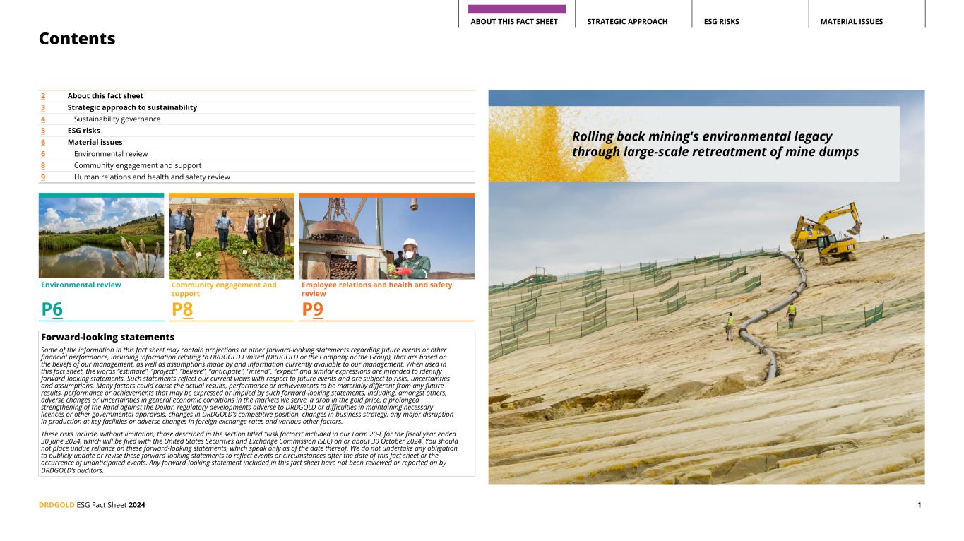 2关于本概况介绍3可持续发展战略方法4可持续发展治理5 ESG风险6重大问题6环境审查8社区参与和支持9人的关系和健康与安全审查环境审查社区参与和支持员工关系和健康与安全审查P6 P8 P9前瞻性陈述本概况介绍中的一些信息可能包含关于未来事件或其他财务业绩的预测或其他前瞻性陈述,包括与DRDGOLD Limited(DRDGOLD或公司或集团)相关的信息,这些信息基于我们管理层的信念,以及我们管理层做出的假设和目前可获得的信息。在这份概况介绍中,“估计”、“项目”、“相信”、“预期”、“打算”、“预期”和类似表述旨在识别前瞻性陈述。此类声明反映了我们目前对未来事件的看法,并受到风险、不确定性和假设的影响。许多因素可能导致实际结果、业绩或成就与此类前瞻性陈述可能明示或暗示的任何未来结果、业绩或成就存在重大差异,其中包括(其中包括)我们所服务的市场的总体经济状况的不利变化或不确定性、金价下跌、兰特兑美元汇率长期走强、对DRDGOLD不利的监管发展或难以维持必要的许可或其他政府批准、DRDGOLD竞争地位的变化、业务战略的变化,关键设施生产的任何重大中断或外汇汇率和各种其他因素的不利变化。这些风险包括但不限于我们截至2024年6月30日的财政年度的20-F表格中标题为“风险因素”一节中描述的风险,该表格将于2024年10月30日左右提交给美国证券交易委员会(SEC)。您不应过分依赖这些前瞻性陈述,这些陈述仅在发布之日起生效。我们不承担任何义务公开更新或修改这些前瞻性陈述,以反映本概况介绍日期之后的事件或情况或意外事件的发生。本概况介绍中包含的任何前瞻性陈述均未经DRDGOLD的审计师审查或报告。关于本概况介绍战略方法ESG风险重大问题目录DRDGOLD ESG概况介绍2024 1通过对矿场倾倒场进行大规模再处理,回滚矿业的环境遗产