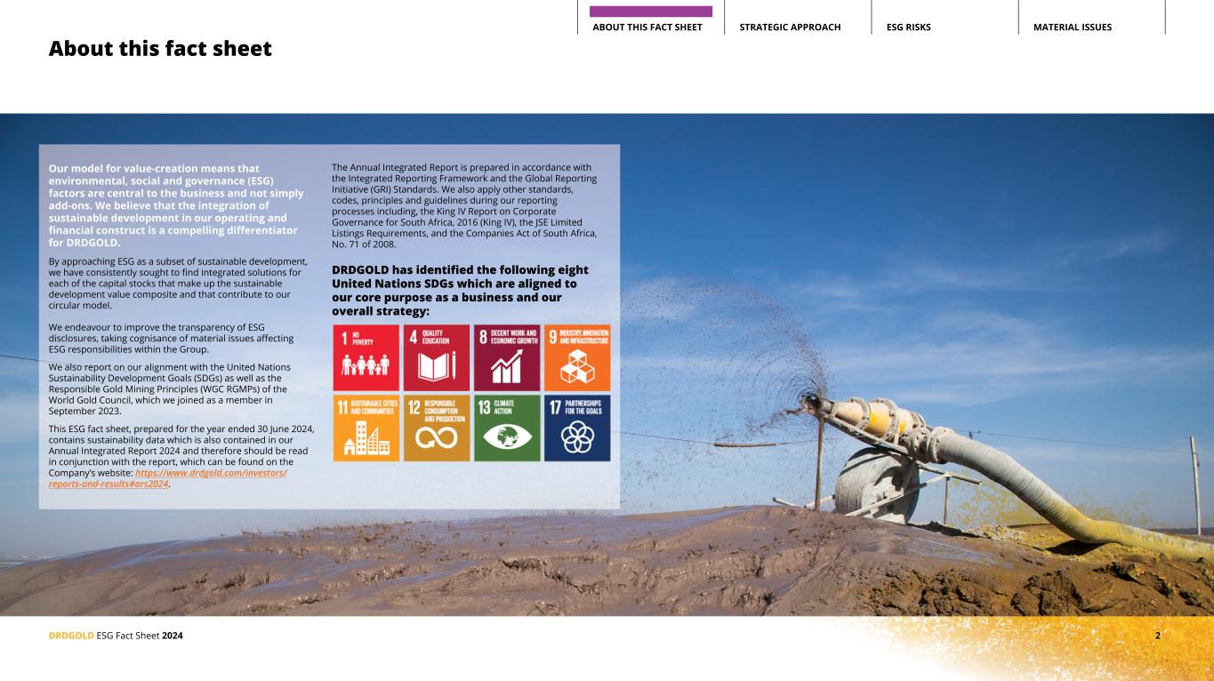 我们的价值创造模型意味着,环境、社会和治理(ESG)因素是企业的核心,而不仅仅是附加因素。我们认为,在我们的经营和财务结构中融入可持续发展是DRDGOLD引人注目的差异化因素。通过将ESG视为可持续发展的一个子集,我们一直寻求为构成可持续发展价值组合并有助于我们的循环模型的每个资本存量找到综合解决方案。我们努力提高ESG披露的透明度,考虑到影响集团内ESG责任的重大问题。我们还报告了我们与联合国可持续发展目标(SDGs)以及世界黄金协会负责任的黄金开采原则(WGC RGMPs)的一致性,我们于2023年9月作为成员加入了该协会。这份ESG概况介绍是为截至2024年6月30日止年度编制的,其中包含可持续发展数据,这些数据也包含在我们的2024年年度综合报告中,因此应与该报告一起阅读,该报告可在公司网站上找到:https://www.drdgold.com/investors/reports-and-results#ars2024。年度综合报告是根据综合报告框架和全球报告倡议组织(GRI)标准编制的。我们还在报告过程中应用其他标准、守则、原则和准则,包括《2016年南非公司治理King IV报告》(King IV)、《JSE Limited上市要求》和《南非公司法》(2008年第71号)。DRDGOLD确定了以下八项联合国可持续发展目标,这些目标与我们作为企业的核心宗旨和我们的总体战略相一致:关于本概况介绍战略方法ESG风险材料问题关于本概况介绍DRDGOLD ESG概况介绍20242
