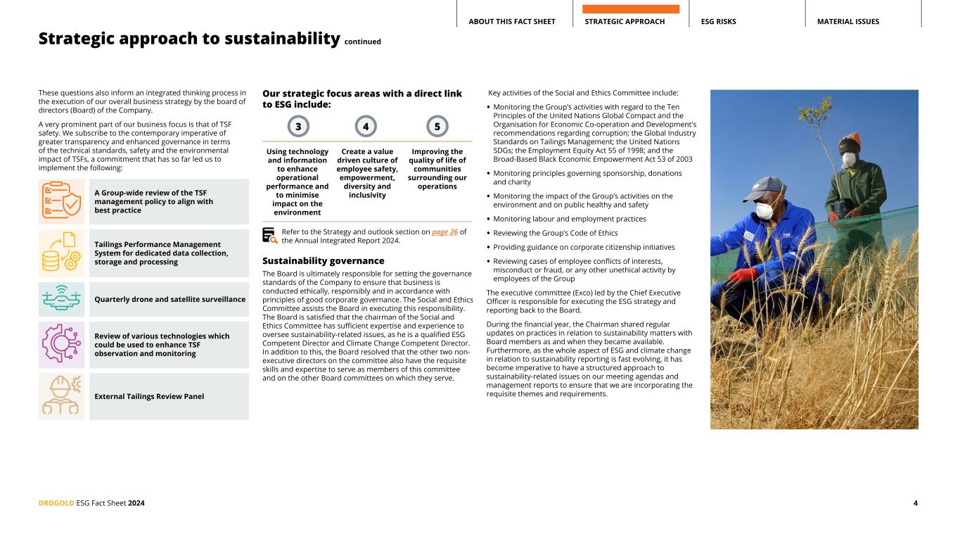这些问题也为公司董事会(董事会)在执行我们的整体业务战略时提供了一个综合思考过程。我们业务重点的一个非常突出的部分是TSF安全。我们赞同在TSF的技术标准、安全和环境影响方面提高透明度和加强治理的当代必要性,这一承诺迄今已使我们实施了以下承诺:对TSF管理政策进行全集团审查,以符合专门数据收集的最佳实践尾矿绩效管理系统,存储和处理可用于加强TSF观察和监测外部尾矿审查小组的各种技术的季度无人机和卫星监视审查我们与ESG直接相关的战略重点领域包括:利用技术和信息来提高运营绩效并最大限度地减少对环境的影响创造员工安全、赋权、多样性和包容性的价值驱动文化提高我们运营周围社区的生活质量,请参阅2024年年度综合报告第26页的战略和展望部分。可持续发展治理董事会最终负责制定公司的治理标准,以确保以合乎道德、负责任的方式并按照良好公司治理的原则开展业务。社会和道德委员会协助董事会履行这一职责。董事会感到满意的是,社会和道德委员会主席拥有足够的专业知识和经验来监督与可持续发展相关的问题,因为他是一名合格的ESG主管和气候变化主管。除此之外,董事会决议,委员会的其他两名非执行董事亦具备必要的技能和专门知识,以担任该委员会以及他们所服务的其他董事会委员会的成员。社会和道德委员会的主要活动包括:•监测小组在《联合国全球契约》十项原则和经济合作与发展组织关于腐败的建议方面的活动;关于尾矿管理的全球行业标准;联合国可持续发展目标;1998年《就业公平法案》第55号;以及2003年《基础广泛的黑人经济赋权法案第53号》•监测关于赞助的原则,捐赠和慈善•监测集团活动对环境以及公众健康和安全的影响•监测劳动和就业实践•审查集团的Code of Ethics •就企业公民倡议提供指导•审查员工利益冲突、不当行为或欺诈或集团员工的任何其他不道德活动的案例由首席执行官领导的执行委员会(Exco)负责执行ESG战略并向董事会报告。在本财政年度,主席定期与董事会成员分享可持续发展事项相关做法的最新信息。此外,由于与可持续发展报告相关的ESG和气候变化的整个方面正在快速发展,因此必须在我们的会议议程和管理报告中对可持续发展相关问题采取结构化的方法,以确保我们纳入必要的主题和要求。关于本概况介绍战略方法ESG风险重大问题可持续发展战略方法续DRDGOLD ESG概况介绍20244345