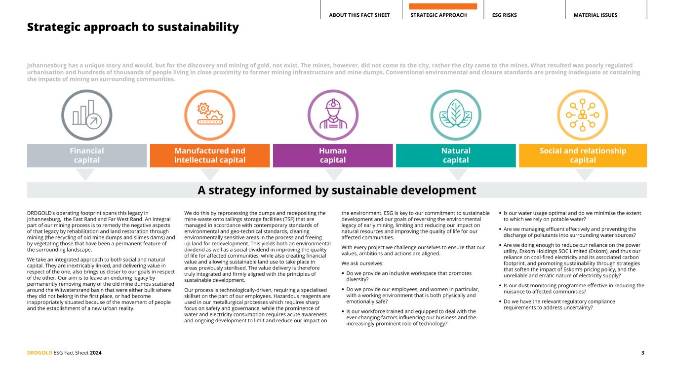 约翰内斯堡有一个独特的故事,将,但为了发现和开采黄金,不存在。然而,矿山并没有来到城市,而是城市来到了矿山。结果是监管不力的城市化以及数十万人居住在前采矿基础设施和矿场附近。事实证明,常规的环境和封闭标准不足以遏制采矿对周边社区的影响。金融资本制造和智力资本人力资本自然资本社会和关系资本以可持续发展为基础的战略DRDGOLD的经营足迹跨越了约翰内斯堡、东兰德和远西兰德的这一遗产。我们采矿过程的一个组成部分是,通过采矿(回收旧矿场垃圾场和煤泥坝)以及对那些一直是周围景观永久特征的地方进行植被,通过恢复和土地恢复来补救这一遗产的负面影响。我们对社会资本和自然资本采取一体化的做法。它们有着千丝万缕的联系,在尊重一个方面传递价值,也让我们在尊重另一个方面更接近我们的目标。我们的目标是通过永久移除散落在威特沃特斯兰德盆地周围的许多旧矿场留下经久不衰的遗产,这些矿场要么建在最初不属于它们的地方,要么由于人员流动和建立新的城市现实而变得位置不合适。我们这样做的方式是,对垃圾场进行再处理,并将矿山废物重新堆存到尾矿储存设施(TSF)上,这些设施按照当代环境和地质技术标准进行管理,在此过程中清洁环境敏感区域,并腾出土地进行再开发。这在改善受影响社区的生活质量方面既产生了环境红利,也产生了社会红利,同时还创造了财务价值,并允许在以前已绝育的地区进行可持续的土地使用。因此,价值交付真正与可持续发展的原则相结合并牢固地保持一致。我们的流程是技术驱动的,需要我们员工的专门技能。危险试剂被用于我们的冶金工艺,这需要高度关注安全和治理,而水电消耗的突出需要敏锐的意识和持续的发展,以限制和减少我们对环境的影响。ESG是我们致力于可持续发展的关键,也是我们扭转早期采矿的环境遗留问题、限制和减少我们对自然资源的影响以及改善受影响社区生活质量的目标的关键。对于每一个项目,我们都要挑战自己,以确保我们的价值观、抱负和行动保持一致。我们自问:•我们是否提供了一个促进多样性的包容性工作空间?•我们是否为我们的员工,特别是女性,提供了一个身体和情感都安全的工作环境?•我们的员工队伍是否经过培训和装备,以应对不断变化的影响我们业务的因素和日益突出的技术作用?•我们的用水是否达到最佳,我们是否最大限度地减少了对饮用水的依赖?•我们是否在有效管理出水,防止污染物排入周边水源?•我们是否做了足够的工作来减少我们对电力公司Eskom Holdings SOC Limited(Eskom)的依赖,从而减少我们对燃煤电力及其相关碳足迹的依赖,并通过软化Eskom定价政策的影响以及电力供应的不可靠和不稳定性质的战略来促进可持续发展?•我们的粉尘监测计划在减少对受影响社区的滋扰方面是否有效?•我们是否具备应对不确定性的相关监管合规要求?关于本概况介绍战略方法ESG风险材料问题可持续发展战略方法DRDGOLD ESG概况介绍20243