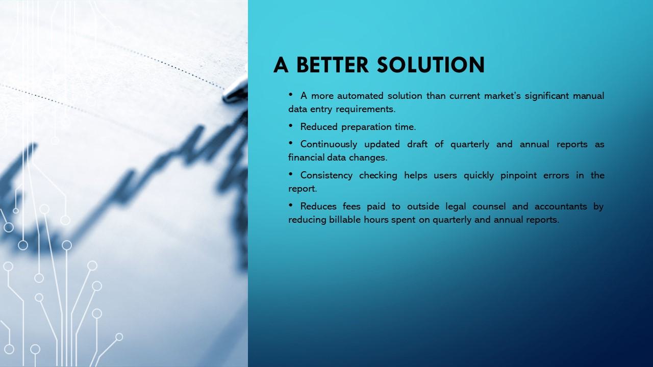更好的解决方案•比当前市场的大量手动数据输入要求更自动化的解决方案。•准备时间缩短。•随着财务数据变化不断更新季度和年度报告草稿。•一致性检查有助于用户快速查明报告中的错误。•通过减少在季度和年度报告上花费的可计费时间,减少支付给外部法律顾问和会计师的费用。