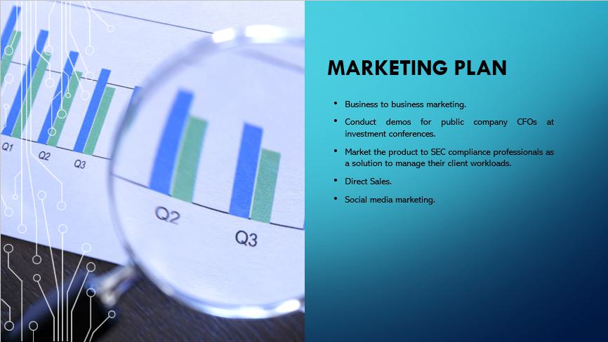 营销计划•企业对企业营销。•在投资会议上为上市公司CFO进行演示。•向SEC合规专业人员推销该产品,作为管理其客户工作负载的解决方案。•直销。•社交媒体营销。