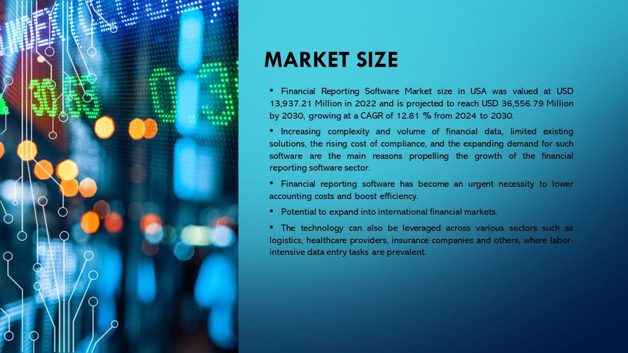 市场规模•美国财务报告软件市场规模估值为13,937美元。2022年为2100万,预计将达到36,556美元。到2030年达到7900万,复合年增长率为12。2024年至2030年的81%。•财务数据的复杂性和数量不断增加、现有解决方案有限、合规成本不断上升以及对这类软件的需求不断扩大,是推动财务报告软件部门增长的主要原因。• F财务报表软件成为降低会计成本、提振效率的迫切必需品。•拓展国际金融市场的潜力。•该技术还可以应用于物流、医疗保健提供者、保险公司等各个部门,这些部门普遍存在劳动密集型数据输入任务。