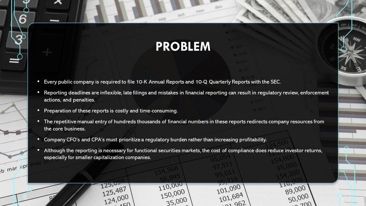 问题•每家上市公司都被要求向SEC提交10-K年度报告和10-Q季度报告。•报告截止日期不灵活,延迟提交和财务报告中的错误可能会导致监管审查、强制执行人的行动和处罚。•编写这些报告既费钱又费时。•这些报告中数十万财务数字的重复手动输入,将公司资源从核心业务中重新定向。•公司CFO和注册会计师必须优先考虑监管负担,而不是提高盈利能力。•尽管报告对于功能正常的证券市场是必要的,但合规成本确实降低了投资者的回报,尤其是对于资本规模较小的公司。