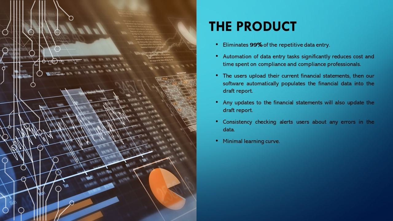 产品•消除了99%的重复数据输入。•数据输入任务的自动化大大降低了合规和合规专业人员的成本和时间。•用户上传他们当前的财务报表,然后我们的软件自动将财务数据填充到报表草稿中。•财务报表的任何更新也将更新报告草稿。•一致性检查会提醒用户数据中的任何错误。•学习曲线最小。