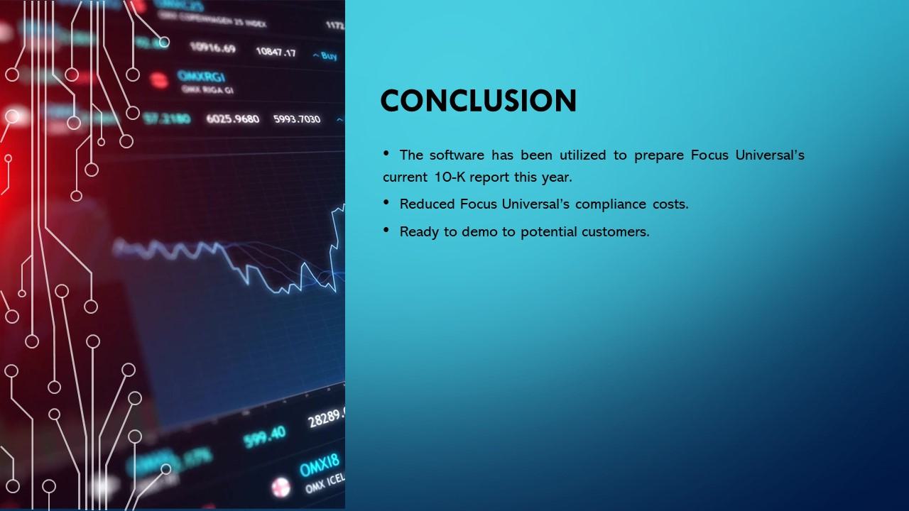 结论•该软件已被用于编制Focus Universal目前的今年10-K报告。•降低了Focus Universal的合规成本。•准备好向潜在客户d emo。