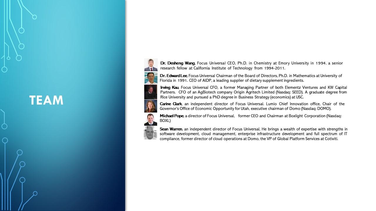 团队Dr. Desheng Wang,Focus Universal首席执行官,1994年在埃默里大学获得化学博士学位。1994-2011年在加州理工学院担任高级研究员。Edward Lee博士,Focus Universal董事会主席,1991年获佛罗里达大学数学博士学位。膳食补充剂成分领先供应商AIDP的CEO。Irving Kau,Focus Universal首席财务官,Elementz Ventures和KW Capital Partners的前管理合伙人。AgBiotech公司奥瑞金种业股份有限公司(纳斯达克:SEED)的首席财务官。莱斯大学研究生学历,在南加州大学攻读商业战略(经济学)博士学位。Focus Universal独立董事Carine Clark。Lumio首席创新办公室、犹他州州长经济机会办公室主席、Domo(纳斯达克:DOMO)执行董事长。Focus Universal独立董事、Boxlight Corporation(纳斯达克:BOXL)前首席执行官兼董事长肖恩·沃伦(Sean Warren),丨聚焦环球Focus Universal董事Michael Pope,他带来了在软件开发、云管理、企业基础设施开发和全方位IT合规方面具有优势的丰富专业知识,曾任Domo云运营总监、Cotiviti全球平台服务副总裁的Domo云运营总监。