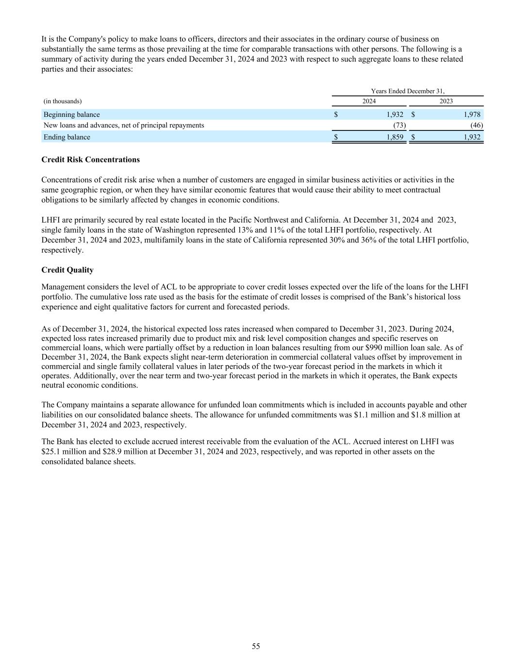 公司的政策是在日常业务过程中向高级职员、董事及其联系人提供贷款,其条款与当时与其他人进行可比交易的现行条款基本相同。以下是截至2024年12月31日和2023年12月31日止年度与这些关联方及其联系人的此类贷款总额相关的活动摘要:截至12月31日止年度,(单位:千)20242023期初余额1,932美元1,978美元新发放贷款和垫款,扣除本金偿还(73)(46)期末余额1,859美元1,932美元信用风险集中当若干客户在同一地理区域从事类似业务活动或活动时,就会产生信用风险集中,或者当它们具有相似的经济特征,会导致它们履行合同义务的能力受到经济状况变化的类似影响时。LHFI主要由位于太平洋西北部和加利福尼亚州的房地产担保。截至2024年12月31日和2023年12月31日,华盛顿州的单户家庭贷款分别占LHFI投资组合总额的13%和11%。截至2024年12月31日和2023年12月31日,加利福尼亚州的多户家庭贷款分别占LHFI总投资组合的30%和36%。信用质量管理认为ACL水平适合覆盖LHFI投资组合在贷款期限内预期的信用损失。作为信贷损失估计基础的累计损失率由银行的历史损失经验和当前和预测期间的八个质量因素组成。截至2024年12月31日,与2023年12月31日相比,历史预期损失率有所增加。2024年期间,预期损失率增加的主要原因是产品组合和风险水平构成的变化以及商业贷款的特定准备金,这部分被我们出售9.9亿美元贷款导致的贷款余额减少所抵消。截至2024年12月31日,该行预计,在其经营所在市场的两年预测期后期,商业抵押品价值的小幅近期恶化将被商业和单户抵押品价值的改善所抵消。此外,在其经营所在市场的近期和两年预测期内,该行预计经济状况将呈中性。公司为未备抵的贷款承诺单独保留备抵,该备抵包含在我们综合资产负债表的应付账款和其他负债中。截至2024年12月31日和2023年12月31日,未提供资金的承付款备抵分别为110万美元和180万美元。银行已选择将应计应收利息排除在ACL的评估之外。截至2024年12月31日和2023年12月31日,LHFI的应计利息分别为2510万美元和2890万美元,在合并资产负债表的其他资产中列报。55