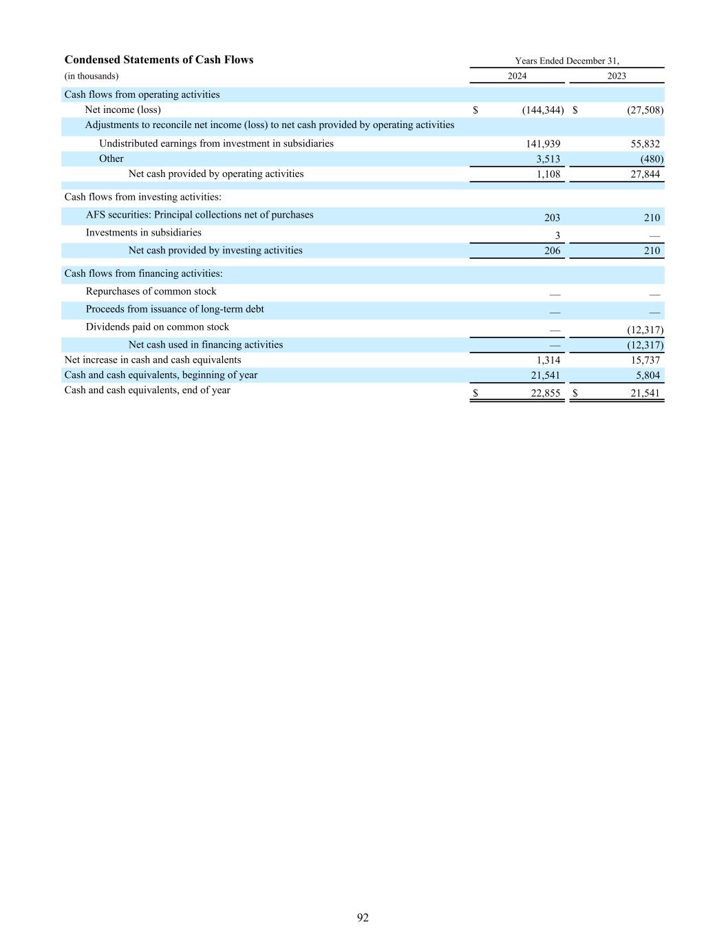 截至12月31日止年度的简明现金流量表,(单位:千)20242023经营活动产生的现金流量净收入(亏损)$(144,344)$(27,508)调整净收益(亏损)与经营活动提供的现金净额对账对账对账对子公司投资未分配收益141,93955,832其他3,513(480)经营活动提供的现金净额1,10827,844投资活动产生的现金流量:AFS证券:本金收款净额203210对子公司的投资3 —投资活动提供的现金净额206210筹资活动产生的现金流量:回购普通股——发行长期债务所得——普通股支付的股利——(12317)筹资活动使用的现金净额—(12317)现金及现金等价物净增加额1,31415,737现金及现金等价物,年初21,5415,804现金及现金等价物,年末22,855美元21,54192