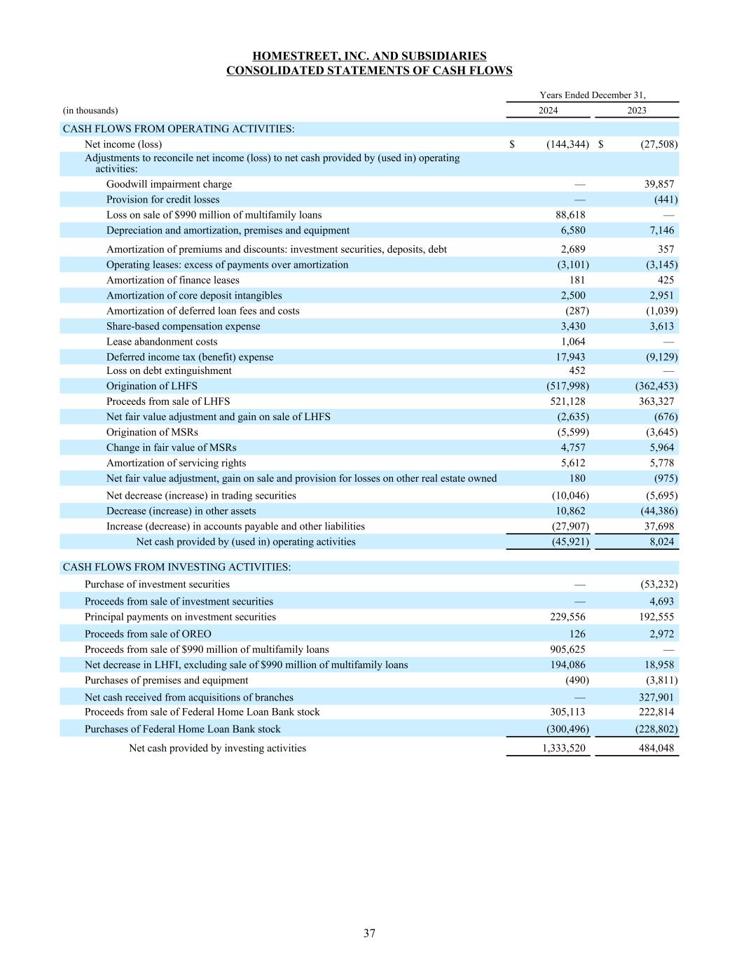 Homestreet, Inc.和子公司合并现金流量表经营活动产生的现金流量:净收入(亏损)$(144,344)$(27,508)调整以调节净收入(亏损)与经营活动提供(用于)的净现金:商誉减值费用— 39,857信用损失准备金—(441)9.9亿美元多户贷款的销售损失88,618 —折旧和摊销、房地和设备6,5807,146溢价和折价摊销:投资证券、存款、债务2,689357经营租赁:付款超过摊销的部分(3,101)(3,145)融资租赁摊销181425核心存款无形资产摊销2,5002,951递延贷款费用和成本摊销(287)(1,039)股份补偿费用3,4303,613租赁放弃成本1,064 —递延所得税(收益)费用17,943(9,129)债务清偿损失452 — LHFS来源(517,998)(362,453)出售LHFS所得款项521,128363,327净公允价值调整出售LHFS收益(2,635)(676)MSR来源(5,599)(3,645)MSR公允价值变动4,7575,964服务权摊销5,6125,778公允价值调整净额,出售收益和自有其他不动产损失准备180(975)交易证券净减少(增加)(10,046)(5,695)其他资产减少(增加)10,862(44,386)应付账款和其他负债增加(减少)(27,907)37,698经营活动提供(用于)的现金净额(45,921)8,024投资活动产生的现金流量:购买投资证券—(53,232)出售投资证券所得款项— 4,693投资证券本金支付229,556192,555出售奥利奥所得款项1262,972出售9.9亿美元多户家庭贷款所得款项905,625 — LHFI净减少,不包括出售9.9亿美元的多户家庭贷款194,08618,958购买房地和设备(490)(3,811)收购分支机构收到的现金净额— 327,901出售联邦Home Loan银行股票的收益305,113222,814购买联邦Home Loan银行股票(300496)(228,802)投资活动提供的现金净额1,333,520484,048年12月31日止,(单位:千)2024202337
