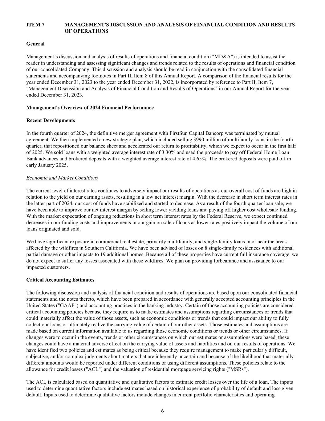 项目7管理层对财务状况和运营结果的讨论和分析一般管理层对运营结果和财务状况(“MD & A”)的讨论和分析旨在帮助读者了解和评估与我们合并公司的运营结果和财务状况相关的重大变化和趋势。本讨论和分析应与本年度报告第二部分第8项中的合并财务报表及随附脚注一并阅读。截至2023年12月31日止年度与截至2022年12月31日止年度的财务业绩比较,以参考方式纳入我们截至2023年12月31日止年度的年报第二部分第7项“管理层对财务状况和经营业绩的讨论和分析”。管理层对2024年财务业绩的概述近期发展2024年第四季度,与FirstSun Capital Bancorp的最终合并协议经双方协议终止。然后,我们实施了一项新的战略计划,其中包括在第四季度出售9.9亿美元的多户家庭贷款,这重新定位了我们的资产负债表,并加速了我们恢复盈利的速度,我们预计这将在2025年上半年发生。我武生物出售加权平均利率为3.30%的贷款,并将所得款项用于偿还加权平均利率为4.65%的联邦Home Loan银行垫款和经纪存款。代理保证金已于2025年1月初还清。经济和市场状况目前的利率水平继续对我们的经营业绩产生不利影响,因为我们的整体资金成本相对于我们的盈利资产收益率较高,导致净息差较低。随着2024年后期短期利率的下降,我们的资金成本已经稳定并开始下降。由于第四季度的贷款出售,我们已经能够通过出售收益率较低的贷款和偿还成本较高的批发融资来改善我们的净息差。随着市场预期美联储将持续降低短期利率,我们预计我们的融资成本将继续下降,我们出售贷款的收益将有所改善,因为较低的利率对我们发起和出售的贷款数量产生了积极影响。我们在商业房地产方面有很大的敞口,主要是多户家庭,以及在受南加州野火影响的地区或附近的单户家庭贷款。我们已被告知8个单户住宅的损失,额外的部分损坏或其他影响到19个额外的房屋。因为所有这些房产都有当前的全险保障,我们预计不会遭受与这些野火相关的任何损失。我们计划为受影响的客户提供宽容和帮助。关键会计估计以下对财务状况和经营业绩的讨论和分析基于我们的合并财务报表及其附注,这些报表是根据美国公认会计原则(“GAAP”)和银行业的会计惯例编制的。其中某些会计政策被视为关键会计政策,因为它们要求我们对可能对这些资产价值产生重大影响的情况或趋势做出估计和假设,例如可能影响我们完全收回贷款或最终实现我们某些其他资产的账面价值的能力的经济状况或趋势。这些估计和假设是根据我们目前可获得的有关这些经济状况或趋势或其他情况的信息作出的。如果我们的估计或假设所依据的事件、趋势或其他情况发生变化,这些变化可能会对资产和负债的账面价值以及我们的经营业绩产生重大不利影响。我们确定了两项至关重要的政策和估计,因为它们要求管理层对本质上不确定的事项做出特别困难、主观和/或复杂的判断,并且因为在不同的条件下或使用不同的假设可能会报告重大不同的金额。这些政策涉及信贷损失备抵(“ACL”)和住宅抵押贷款服务权估值(“MSR”)。ACL是根据定量和定性因素计算的,用于估计贷款期限内的信用损失。用于确定量化因子的输入包括基于违约概率和给定违约损失的历史经验的估计。用于确定定性因素的输入包括当前投资组合特征的变化和操作6