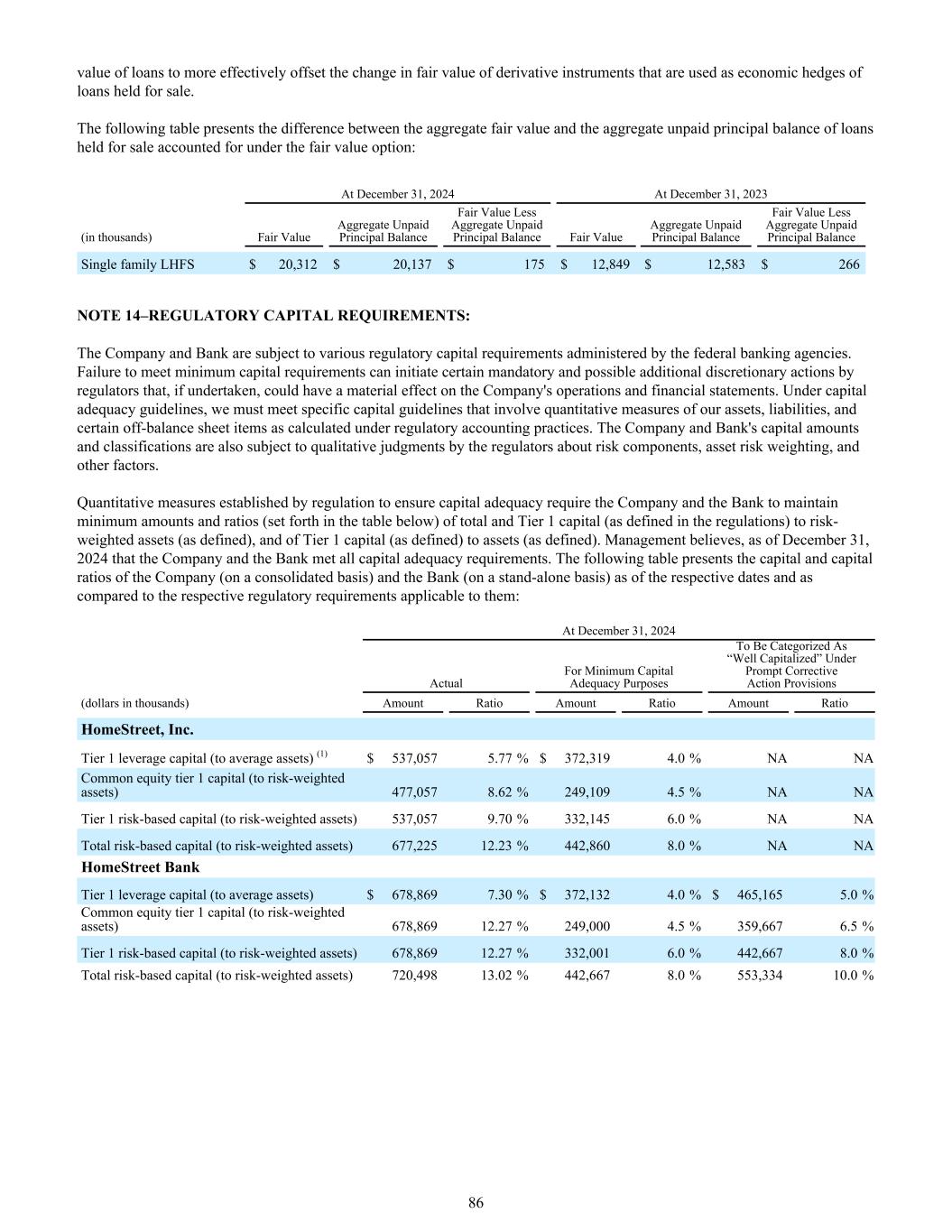 贷款价值,以更有效地抵消作为持有待售贷款经济套期保值的衍生工具的公允价值变动。下表列出根据公允价值选择权入账的持有待售贷款的合计公允价值与合计未付本金余额之间的差额:截至2024年12月31日截至12月31日,2023年(单位:千)公允价值合计未支付本金余额公允价值减去合计未支付本金余额公允价值合计未支付本金余额公允价值减去合计未支付本金余额单户LHFS 20,312美元20,137美元175美元12,849美元12,583美元266美元注14 –监管资本要求:公司和银行受联邦银行机构管理的各种监管资本要求的约束。未能满足最低资本要求可能会引发监管机构的某些强制性和可能的额外酌情行动,如果采取这些行动,可能会对公司的运营和财务报表产生重大影响。在资本充足准则下,我们必须满足特定的资本准则,这些准则涉及根据监管会计惯例计算的我们的资产、负债和某些表外项目的量化计量。公司和银行的资本金额和分类还受制于监管机构对风险成分、资产风险权重等因素的定性判断。监管为确保资本充足而制定的量化措施要求公司和银行保持总资本和一级资本(定义见监管规定)与风险加权资产(定义见定义)、一级资本(定义见定义)与资产(定义见定义)的最低金额和比率(见下表)。管理层认为,截至2024年12月31日,公司和银行满足了所有资本充足率要求。下表列出了公司(合并口径)和银行(单独口径)截至各自日期以及与各自适用的监管要求相比的资本和资本比率:截至2024年12月31日,根据及时纠正措施规定,实际最低资本充足用途归类为“资本充足”(单位:千美元)的金额比率金额比率金额比率金额比率金额比率HomeStreet,Inc.一级杠杆资本(与平均资产比率)(1)$ 537,0575.77% $ 372,3194.0% NA NA普通股权一级资本(与风险加权资产比率)477,0578.62% 249,1094.5% NA NA一级风险资本(与风险加权资产比率)537,0579.70% 332,1456.0% NA NA总风险资本(与风险加权资产比率)677,22512.23% 442,8608.0% NA NA HomeStreet银行一级杠杆资本(与平均资产比率)$ 678,8697.30% $ 372,1324.0% $ 465,1655.0%普通股权一级资本(与风险加权资产比率)678,86912.27% 249,0004.5% 359,6676.5%一级风险资本(与风险加权资产)678,86912.27% 332,0016.0% 442,6678.0%风险资本总额(与风险加权资产)720,49813.02% 442,6678.0% 553,334 10.0% 86