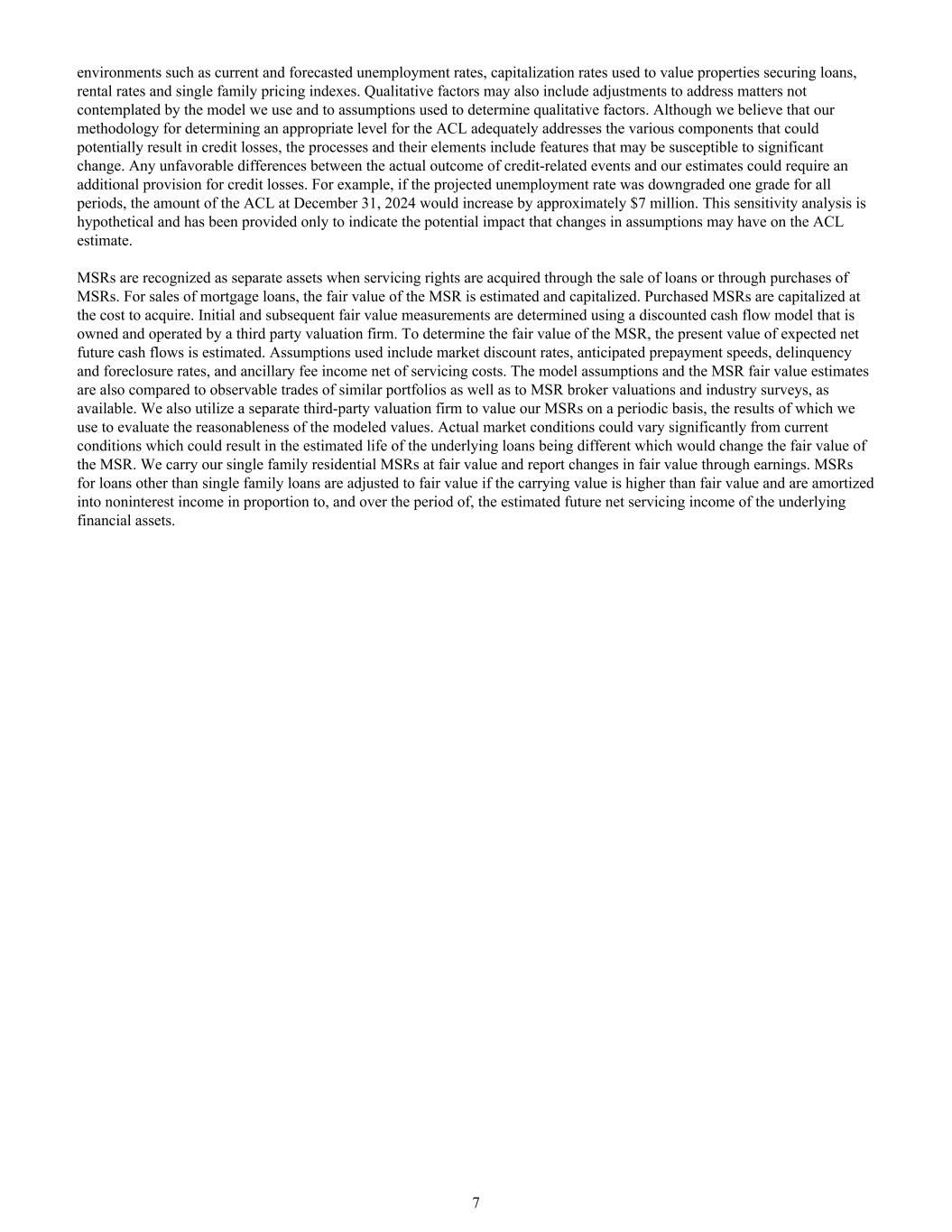 当前和预测的失业率、用于对获得贷款的房产进行估值的资本化率、租金利率和单户家庭定价指数等环境。定性因素还可能包括调整,以解决我们使用的模型未考虑的问题,以及用于确定定性因素的假设。尽管我们认为,我们确定ACL适当水平的方法充分解决了可能导致信用损失的各种组成部分,但这些过程及其要素包括可能容易发生重大变化的特征。信贷相关事件的实际结果与我们的估计之间的任何不利差异都可能需要额外计提信贷损失准备金。例如,如果所有时期的预计失业率都被下调一个等级,那么2024年12月31日的ACL金额将增加约700万美元。这种敏感性分析是假设性的,仅用于表明假设变化可能对ACL估计产生的潜在影响。当通过出售贷款或通过购买MSR获得服务权时,MSR被确认为单独的资产。对于出售抵押贷款,MSR的公允价值被估计并资本化。购买的MSR按获得成本资本化。初始和后续的公允价值计量采用由第三方估值公司拥有和运营的贴现现金流模型确定。为确定MSR的公允价值,估计预期未来现金流量净额的现值。所使用的假设包括市场贴现率、预期的提前还款速度、拖欠和止赎率,以及扣除服务成本的辅助费用收入。模型假设和MSR公允价值估计也与类似投资组合的可观察交易以及可用的MSR经纪人估值和行业调查进行了比较。我们还利用单独的第三方估值公司对我们的MSR进行定期估值,我们使用其结果来评估建模值的合理性。实际市场条件可能与当前条件有很大差异,这可能导致基础贷款的估计寿命不同,从而改变MSR的公允价值。我们以公允价值计量单户住宅MSR,并通过收益报告公允价值变动。非单一家庭贷款的MSR,如果账面价值高于公允价值,则调整为公允价值,并按基础金融资产的估计未来净服务收入的比例和期间摊销为非利息收入。7