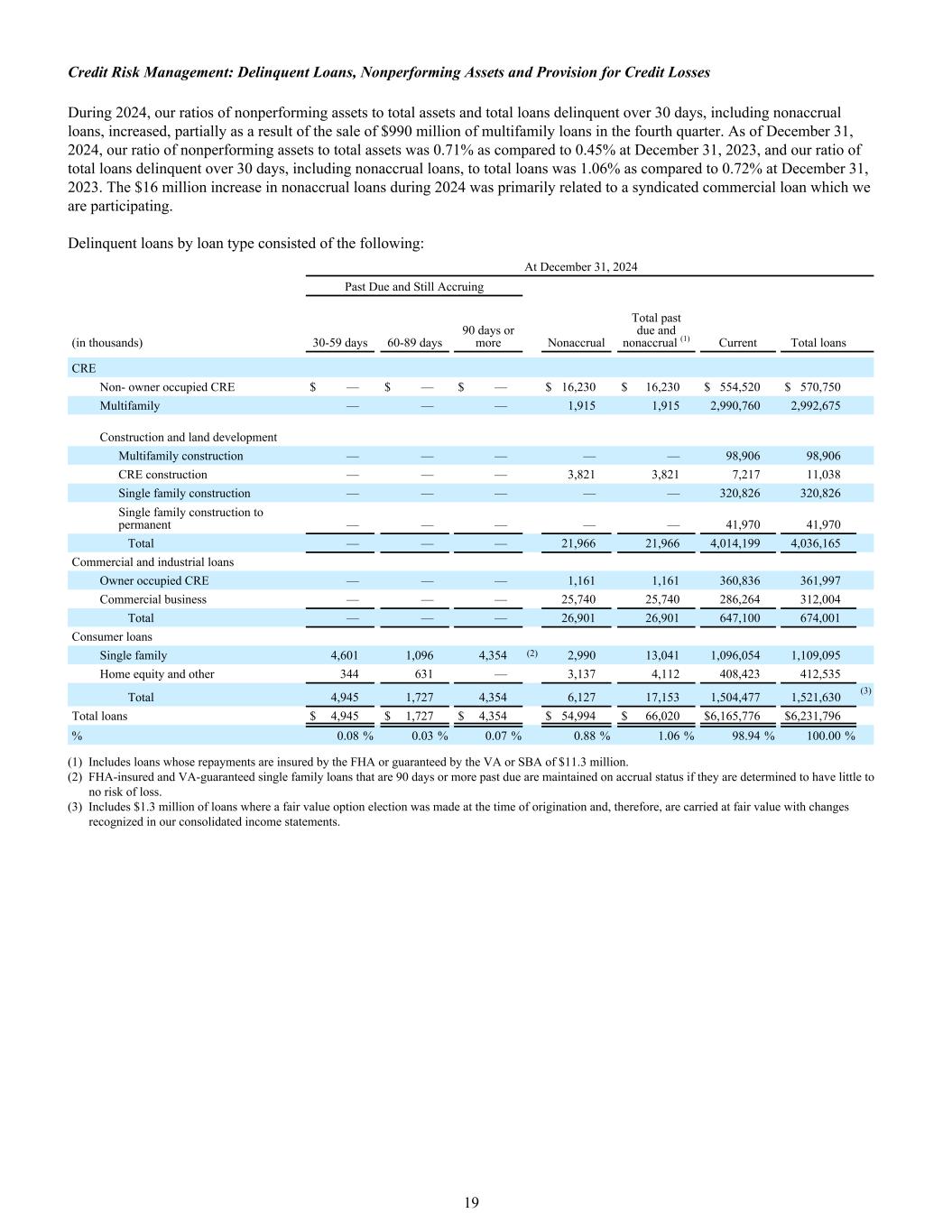 信用风险管理:拖欠贷款、不良资产和信贷损失准备金在2024年期间,我们的不良资产与总资产和拖欠超过30天的总贷款(包括非应计贷款)的比率增加,部分原因是第四季度出售了9.9亿美元的多户家庭贷款。截至2024年12月31日,我们的不良资产与总资产的比率为0.71%,而2023年12月31日为0.45%;我们的30天以上拖欠贷款总额(包括非应计贷款)与总贷款的比率为1.06%,而2023年12月31日为0.72%。2024年非应计贷款增加1600万美元,主要与我们正在参与的一笔银团商业贷款有关。按贷款类型分列的拖欠贷款情况如下:12月31日,2024年逾期和仍应计(千)30-59天60-89天90天以上非应计逾期和非应计总额(1)当前贷款总额CRE非业主占用CRE $ — $ — $ — $ 16,230 $ 16,230 $ 554,520 $ 570,750多户———— 1,9151,9152,990,7602,992,675建筑和土地开发多户建设———— 98,90698,906 CRE建设———— 3,8213,8217,21711,038单户建设———— 320,826320,826单户建设转为永久———— 41,97041,970合计———— 21,96621,9664,014,1994,036,165商业和工业贷款业主占用CRE ———— 1,1611,161360,836361,997商业业务———— 25,74025,740286,264312,004合计———— 26,90126,901647,100674,001消费贷款单户4,6011,0964,354(2)2,99013,0411,096,0541,109,095房屋净值及其他344631 — 3,1374,112408,423412,535合计4,9451,7274,3546,12717,1531,504,4771,521,630(3)贷款总额$ 4,945 $ 1,727 $ 4,354 $ 54,994 $ 66,020 $ 6,165,776 $ 6,231,796% 0.08% 0.03% 0.07% 0.88% 1.06% 98.94% 100.00%(1)包括还款由联邦住房管理局投保或由VA或SBA担保的贷款1130万美元。(2)逾期90天或以上的FHA保险和VA担保的单户贷款,如果确定几乎没有损失风险,则保持应计状态。(3)包括130万美元的贷款,其中在发起时进行了公允价值选择,因此以公允价值列账,并在我们的综合损益表中确认了变动。19