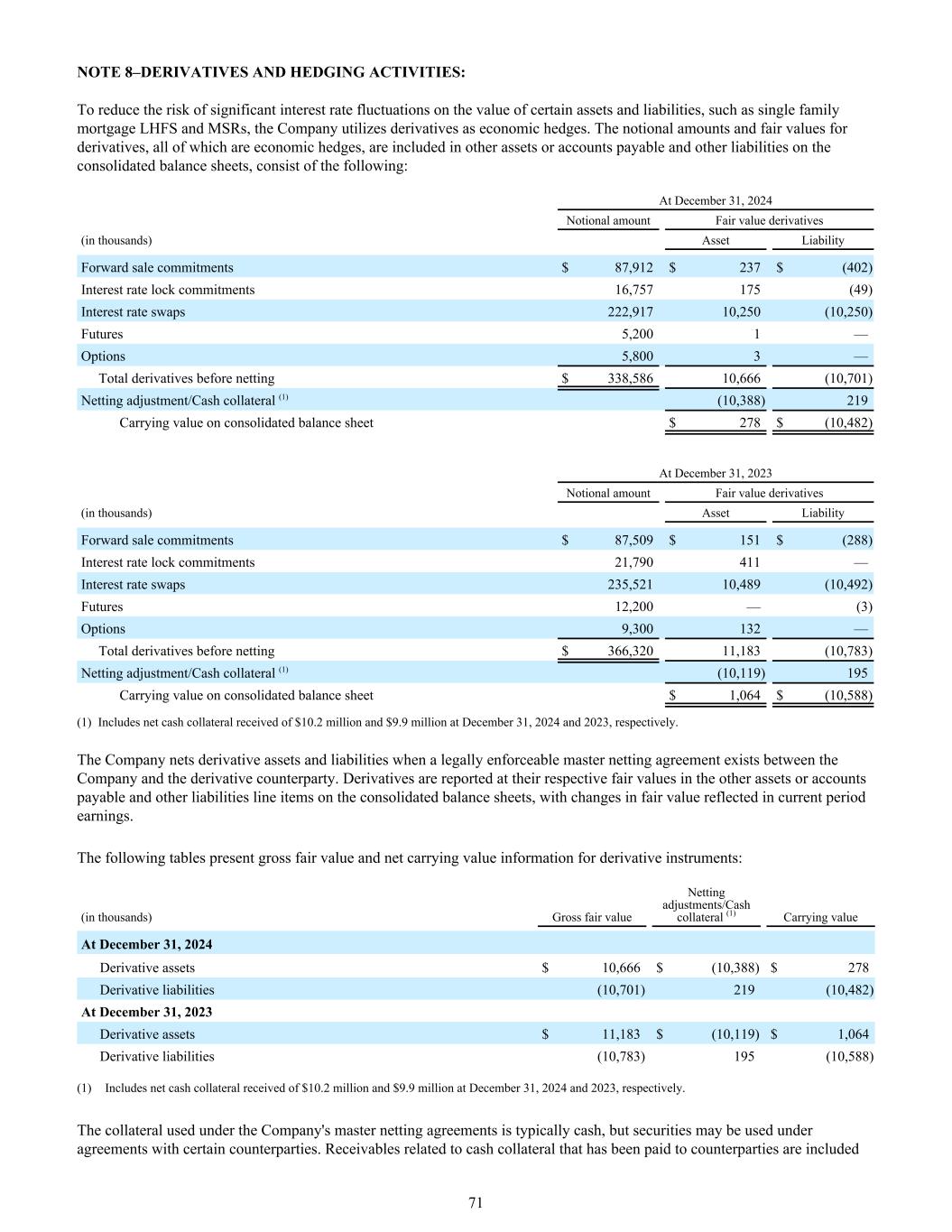 附注8 –衍生品和对冲活动:为降低某些资产和负债,如单户抵押贷款LHFS和MSR的价值出现重大利率波动的风险,公司利用衍生品作为经济对冲。衍生工具的名义金额和公允价值,均为经济套期保值,计入合并资产负债表的其他资产或应付账款和其他负债,由以下部分组成:截至12月31日,2024年名义金额公允价值衍生品(千)资产负债远期销售承诺87,912美元237美元(402)利率锁定承诺16,757175(49)利率掉期222,91710,250(10,250)期货5,2001 —期权5,800 3 —净额前衍生品总额338,58610,666美元(10,701)净额调整/现金抵押品(1)(10,388)219截至12月31日合并资产负债表账面价值278美元(10,482),2023名义金额公允价值衍生品(千)资产负债远期销售承诺87,509美元151美元(288)利率锁定承诺21,790411 —利率掉期235,52110,489(10,492)期货12,200 —(3)期权9,300132 —净额前衍生品总额366,320111,183美元(10,783)净额调整/现金抵押品(1)(10,119)195合并资产负债表账面价值1,064美元(10,588)(1)包括2024年12月31日和2023年12月31日分别收到的现金抵押品净额1020万美元和990万美元。当公司与衍生交易对手之间存在具有法律效力的净额结算主协议时,公司对衍生资产和负债进行净额结算。衍生工具在合并资产负债表的其他资产或应付账款及其他负债项目中按其各自的公允价值列报,公允价值变动反映在当期收益中。下表列出了衍生工具的公允价值总额和账面净值信息:(单位:千)公允价值净额调整总额/现金抵押品(1)2024年12月31日账面价值衍生资产$ 10,666 $(10,388)$ 278衍生负债(10,701)219(10,482)2023年12月31日衍生资产$ 11,183 $(10,119)$ 1,064衍生负债(10,783)195(10,588)(1)包括2024年12月31日和2023年12月31日收到的现金抵押品净额分别为1020万美元和990万美元。根据公司的净额结算主协议使用的抵押品通常是现金,但可能根据与某些交易对手的协议使用证券。已支付给交易对手的与现金担保物相关的应收款项列入71