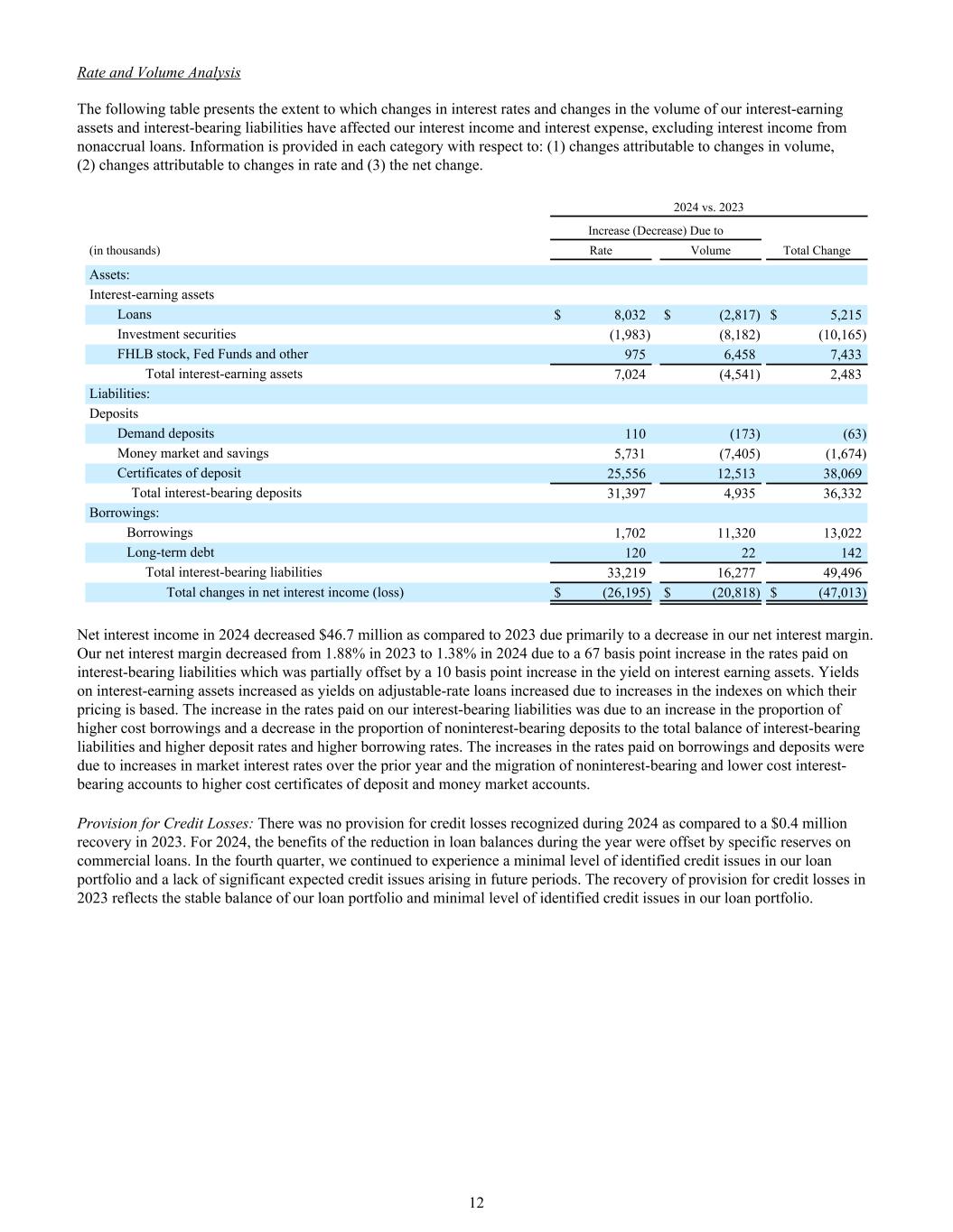 利率和数量分析下表列出了利率变化以及我们的生息资产和计息负债的数量变化对我们的利息收入和利息支出的影响程度,不包括来自非应计贷款的利息收入。在每个类别中提供有关以下方面的信息:(1)可归因于数量变化的变化,(2)可归因于费率变化的变化和(3)净变化。2024年与2023年增加(减少)因总变化(千)率交易量资产:生息资产贷款$ 8,032 $(2,817)$ 5,215投资证券(1,983)(8,182)(10,165)FLB股票,联邦基金和其他9756,4587,433生息资产总额7,024(4,541)2,483负债:存款活期存款110(173)(63)货币市场和储蓄5,731(7,405)(1,674)存单25,55612,51338,069计息存款总额31,3974,93536,332借款:借款1,70211,32013,022长期债务12022142计息负债总额33,21916,27749,496净利息收入(亏损)变动总额$(26,195)$(20,818)$(47,013)2024年的净利息收入比2023年减少4670万美元,主要是由于我们的净息差下降。我们的净息差从2023年的1.88%下降至2024年的1.38%,原因是付息负债支付的利率提高了67个基点,但部分被生息资产收益率提高10个基点所抵消。生息资产收益率上升,因为可调整利率贷款的收益率上升,原因是其定价所依据的指数上升。我们的有息负债支付的利率上升是由于较高成本借款的比例增加,无息存款占有息负债总余额的比例下降,以及较高的存款利率和较高的借款利率。为借款和存款支付的利率上升是由于市场利率比上一年有所上升,以及无息和成本较低的计息账户向成本较高的存单和货币市场账户迁移。信用损失准备金:没有为2024年期间确认的信用损失准备金,而2023年收回了40万美元。就2024年而言,年内贷款余额减少的好处被商业贷款的特定准备金所抵消。在第四季度,我们继续在我们的贷款组合中遇到最低程度的已确定信贷问题,并且在未来期间没有出现重大的预期信贷问题。2023年信贷损失拨备的收回反映了我们贷款组合的稳定余额以及我们贷款组合中已识别的信贷问题的最低水平。12