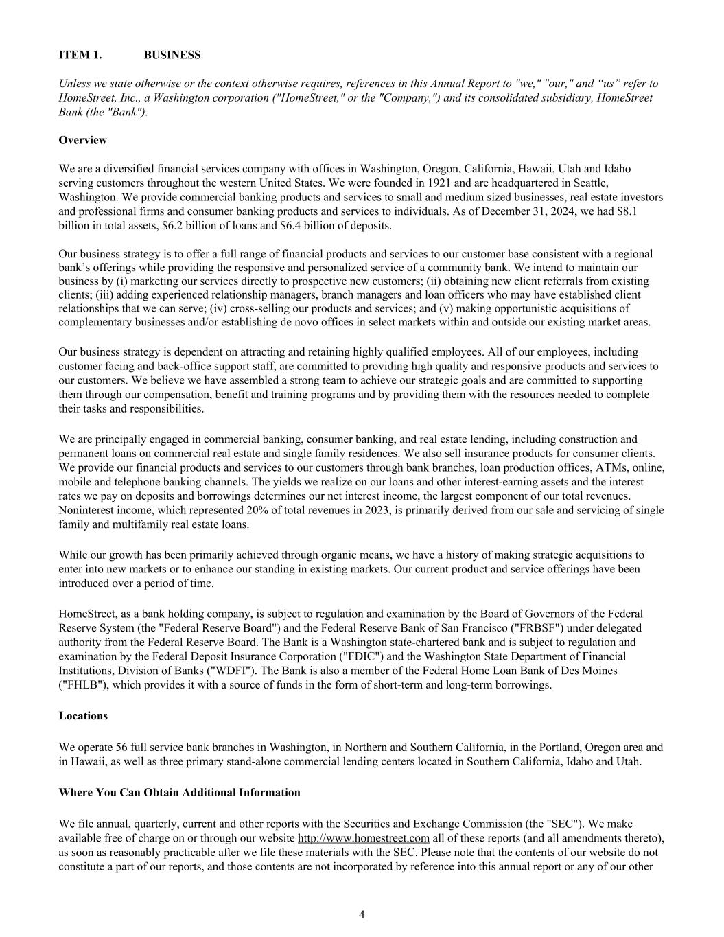 项目1。业务除非我们另有说明或上下文另有要求,否则本年度报告中提及的“我们”“我们的”和“我们”均指HomeStreet,Inc.,一家华盛顿公司(“HomeStreet”或“公司”)及其合并子公司HomeStreet银行(“银行”)。概述我们是一家多元化的金融服务公司,在华盛顿、俄勒冈州、加利福尼亚州、夏威夷州、犹他州和爱达荷州设有办事处,为美国西部的客户提供服务。我们成立于1921年,总部位于华盛顿州西雅图。我们向中小型企业、房地产投资者和专业公司提供商业银行产品和服务,向个人提供消费者银行产品和服务。截至2024年12月31日,我们的总资产为81亿美元,贷款为62亿美元,存款为64亿美元。我们的业务战略是向我们的客户群提供与区域银行产品一致的全方位金融产品和服务,同时提供社区银行的响应式和个性化服务。我们打算通过以下方式维持我们的业务:(i)直接向潜在新客户推销我们的服务;(ii)从现有客户那里获得新客户推荐;(iii)增加经验丰富的客户关系经理、分行经理和信贷员,他们可能已经建立了我们可以服务的客户关系;(iv)交叉销售我们的产品和服务;以及(v)机会性地收购互补业务和/或在我们现有市场区域内外的特定市场建立从头办事处。我们的业务战略依赖于吸引和留住高素质的员工。我们的所有员工,包括面向客户和后台支持人员,都致力于为我们的客户提供高质量和响应迅速的产品和服务。我们相信,我们已经组建了一支强大的团队来实现我们的战略目标,并致力于通过我们的薪酬、福利和培训计划以及为他们提供完成任务和责任所需的资源来支持他们。我们主要从事商业银行业务、消费者银行业务和房地产贷款业务,包括商业房地产和单户住宅的建筑和永久贷款业务。我们还为消费者客户销售保险产品。我们通过银行分行、贷款生产处、ATM、在线、移动和电话银行渠道向客户提供我们的金融产品和服务。我们在贷款和其他生息资产上实现的收益率以及我们为存款和借款支付的利率决定了我们的净利息收入,这是我们总收入的最大组成部分。非利息收入占2023年总收入的20%,主要来自我们对单户和多户房地产贷款的销售和服务。虽然我们的增长主要是通过有机方式实现的,但我们有进行战略收购以进入新市场或提高我们在现有市场的地位的历史。我们目前提供的产品和服务是在一段时间内推出的。HomeStreet作为一家银行控股公司,根据联邦储备委员会的授权,接受美国联邦储备系统理事会(“联邦储备委员会”)和旧金山联邦储备银行(“FRBSF”)的监管和审查。该银行是一家华盛顿州特许银行,接受美国联邦存款保险公司(Federal Deposit Insurance Corporation,简称“FDIC”)和华盛顿州银行事业部(WDFI)的监管和审查。该银行还是联邦得梅因Home Loan银行(“FHLB”)的成员,该银行以短期和长期借款的形式为其提供资金来源。地点我们在华盛顿、北加州和南加州、俄勒冈州波特兰地区和夏威夷经营56家提供全方位服务的银行分行,并在南加州、爱达荷州和犹他州经营三个主要的独立商业贷款中心。您可以在哪里获得额外信息我们向美国证券交易委员会(“SEC”)提交年度、季度、当前和其他报告。我们在向SEC提交这些材料后在合理可行的范围内尽快在我们的网站http://www.homestreet.com上或通过我们的网站免费提供所有这些报告(及其所有修订)。请注意,我们网站的内容不构成我们报告的一部分,这些内容并未通过引用方式并入本年度报告或我们的任何其他4