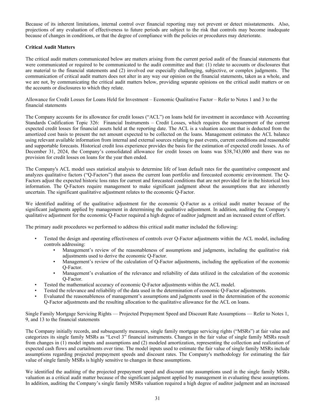财务报告内部控制由于其固有的局限性,可能无法防止或发现错报。此外,对未来期间的任何有效性评估的预测都受到以下风险的影响:由于条件的变化,控制可能变得不充分,或者政策或程序的遵守程度可能恶化。关键审计事项下文通报的关键审计事项是已向审计委员会通报或要求通报的财务报表当期审计产生的事项,涉及:(1)涉及对财务报表具有重要意义的账目或披露,以及(2)涉及我们特别具有挑战性、主观或复杂的判断。关键审计事项的沟通不会以任何方式改变我们对财务报表的意见,作为一个整体,我们不会通过传达下文的关键审计事项,就关键审计事项或与其相关的账目或披露提供单独的意见。为投资而持有的贷款的信用损失准备–经济定性因素–请参阅财务报表附注1和3公司根据会计准则编纂专题326:金融工具–信用损失对其为投资而持有的贷款的信用损失准备(“ACL”)进行会计处理,这要求计量在报告日持有的金融资产的当前预期信用损失。ACL是一个估值账户,从摊余成本基础中扣除,以表示预期将在贷款上收取的净额。管理层使用来自内部和外部来源的有关过去事件、当前状况以及合理和可支持的预测的相关可用信息来估计ACL余额。历史信用损失经验为预期信用损失的估算提供了依据。截至2024年12月31日,公司的贷款综合信贷损失准备金为38,743,000美元,在该日终了年度没有贷款信贷损失准备金。公司的ACL模型使用统计分析来确定定量部分的贷款违约率寿命,并分析评估当前贷款组合和预测经济环境的定性因素(“Q-Factors”)。Q-因子针对历史损失信息中未提供的当前和预测情况调整预期历史损失率。Q-因子要求管理层对本质上不确定的假设做出重大判断。显著的质的调整与经济Q因子有关。由于管理层在确定定性调整时应用了重大判断,我们将经济Q-因子质调整的审计确定为关键审计事项。此外,审计公司对经济Q-因子质的调整,需要审计师的高度判断和加大力度。我们为处理这一关键审计事项而执行的主要审计程序包括:•测试了ACL模型内对Q-Factor调整的控制的设计和运行有效性,包括针对:▪管理层对假设和判断合理性的审查,包括用于推导经济Q-因子的定性风险调整。▪管理层对Q-Factor调整计算的审查,包括经济Q-Factor的应用。▪管理层对经济Q-因子计算中使用的数据的相关性和可靠性的评估。•测试了ACL模型内经济Q-Factor调整的数学精度。•测试了经济Q因子调整确定所用数据的相关性和可靠性。•评估管理层在确定经济Q-Factor调整时所使用的假设和判断的合理性以及由此产生的对贷款ACL定性备抵的分配。单一家庭抵押贷款服务权——预计的提前还款速度和贴现率假设——请参阅财务报表附注1、9和13。公司最初记录并随后计量了按公允价值计算的单一家庭抵押贷款服务权(“MSRs”),并将其单一家庭MSRs归类为“第3级”金融工具。单户MSR公允价值变动是由于(1)模型输入和假设以及(2)模型摊销的变化, 表示随着时间的推移,预期现金流和缩减的收集和实现。用于估计单户MSR公允价值的模型输入包括有关预计提前还款速度和贴现率的假设。该公司估计单户MSR公允价值的方法对这些假设的变化高度敏感。由于管理层在评估这些假设时应用了重大判断,我们将对单家MSR估值中使用的预计提前还款速度和贴现率假设的审计确定为关键审计事项。此外,审计公司单家MSRs估值需要审计师高度判断和增加31