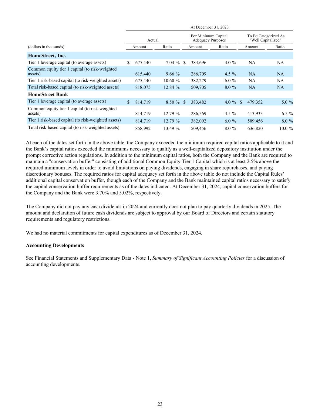 截至2023年12月31日实际最低资本充足率用途归类为“资本充足”(单位:千美元)的金额比率金额比率金额比率HomeStreet,Inc.一级杠杆资本(与平均资产比率)$ 675,4407.04% $ 383,6964.0% NA NA普通股权一级资本(与风险加权资产比率)615,4409.66% 286,7094.5% NA NA一级风险资本(与风险加权资产比率)675,44010.60% 382,2796.0% NA总风险资本(与风险加权资产比率)818,07512.84% 509,7058.0% NA NA HomeStreet银行一级杠杆资本(与平均资产比率)$ 814,7198.50% $ 383,4824.0% $ 479,3525.0%普通股权一级资本(与风险加权资产比率)814,71912.79% 286,5694.5% 413,9336.5%一级风险资本(与风险加权资产相比)814,71912.79% 382,0926.0% 509,4568.0%风险资本总额(与风险加权资产相比)858,99213.49% 509,4568.0% 636,8201.0%在上表所列各日期,公司均超过了适用于其的最低要求资本比率,且本行的资本比率均超过了《及时纠正措施规定》规定的资本充足存款机构资格所需的最低限度。除了最低资本比率外,公司和银行都需要维持一个“保护缓冲”,包括额外的普通股一级资本,该资本至少比规定的最低水平高出2.5%,以避免在支付股息、从事股票回购和支付酌情奖金方面受到限制。上表所列的资本充足所需比率不包括《资本规则》的额外资本节约缓冲,尽管截至所示日期,公司和银行各自维持了满足资本节约缓冲要求所需的资本比率。于2024年12月31日,公司及本行的资本节约缓冲分别为3.70%及5.02%。公司2024年未进行任何现金分红,目前不打算在2025年进行季度分红。未来现金分红的金额和宣派取决于我们董事会的批准以及某些法定要求和监管限制。截至2024年12月31日,我们没有重大的资本支出承诺。会计发展见财务报表和补充数据-附注1,重要会计政策摘要,以讨论会计发展。23