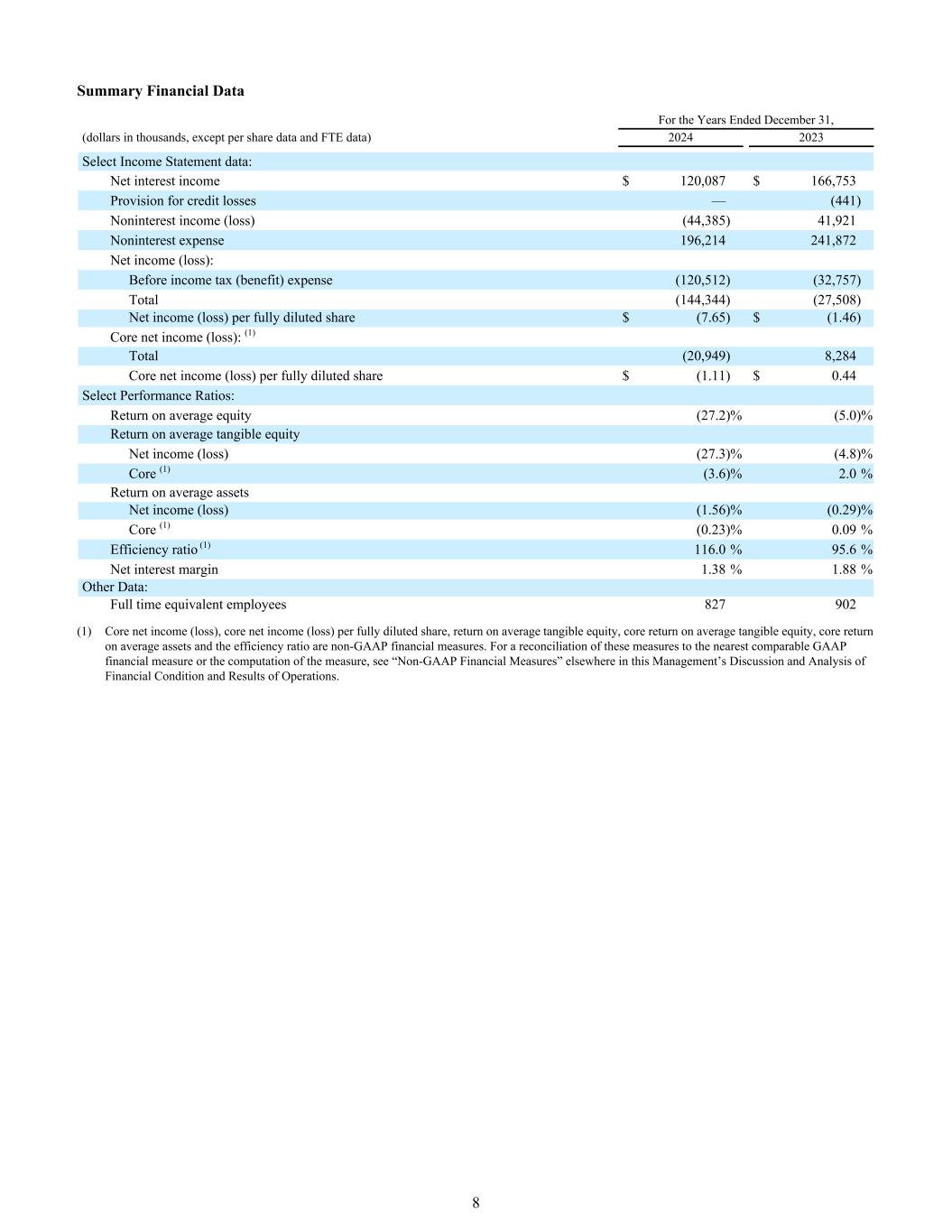 截至12月31日止年度财务数据摘要,(单位:千美元,每股数据除外和FTE数据)20242023 Select Income报表数据:净利息收入120,087美元166,753美元拨备信用损失—(441)非利息收入(亏损)(44,385)41,921非利息支出196,214241,872净收益(亏损):所得税(收益)支出前(120,512)(32,757)合计(144,344)(27,508)每股完全稀释后净收益(亏损)$(7.65)$(1.46)核心净收入(亏损):(1)合计(20,949)8,284每股完全稀释后核心净收入(亏损)$(1.11)$ 0.44选择绩效比率:平均股本回报率(27.2)%(5.0)%平均有形股本回报率净收益(亏损)(27.3)%(4.8)%核心(1)(3.6)% 2.0%平均资产回报率净收益(亏损)(1.56)%(0.29)%核心(1)(0.23)% 0.09%效率比(1)116.0% 95.6%净息差1.38% 1.88%其他数据:全时等效员工827902(1)核心净收入(亏损)、每股全面摊薄核心净收入(亏损)、平均有形股本回报率、平均有形股本核心回报率、平均资产核心回报率和效率比为非公认会计准则财务指标。有关这些措施与最接近的可比GAAP财务措施的对账或措施的计算,请参阅本管理层对财务状况和运营结果的讨论和分析中其他地方的“非GAAP财务措施”。8