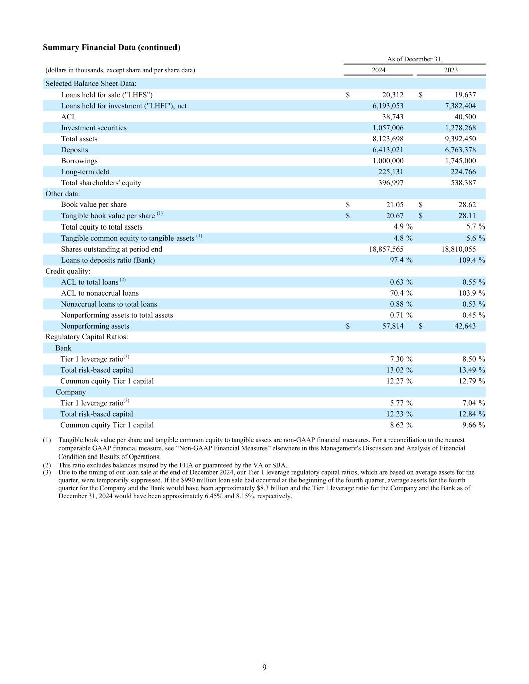 财务数据摘要(续)截至12月31日,(单位:千美元,股份和每股数据除外)20242023部分资产负债表数据:持有待售贷款(“LHFS”)20,312美元19,637美元持作投资贷款(“LHFI”),净额6,193,0537,382,404 ACL 38,74340,500投资证券1,057,0061,278,268总资产8,123,6989,392,450存款6,413,0216,763,378借款1,000,0001,745,000长期债务225,131224,766总股东权益396,997538,387其他数据:每股账面价值$ 21.05 $ 28.62每股有形账面价值(1)$ 20.67 $ 28.11总权益占总资产4.9% 5.7%有形普通股权益占有形资产(1)4.8% 5.6%期末流通股18,857,56518,810,055贷款与存款比率(银行)97.4% 109.4%信用质量:ACL占贷款总额(2)0.63% 0.55% ACL占非应计贷款70.4% 103.9%非应计贷款占总贷款0.88% 0.53%不良资产占总资产0.71% 0.45%不良资产$ 57,814 $ 42,643监管资本比率:银行一级杠杆率(3)7.30% 8.50%风险资本总额13.02% 13.49%普通股一级资本12.27% 12.79%公司一级杠杆率(3)5.77% 7.04%风险资本总额12.23% 12.84%普通股一级资本8.62% 9.66%(1)每股有形账面价值和有形普通股权益占有形资产非公认会计准则财务计量。有关与最接近的可比GAAP财务指标的对账,请参阅本管理层对财务状况和运营结果的讨论和分析中其他地方的“非GAAP财务指标”。(2)该比率不包括由FHA投保或由VA或SBA担保的余额。(3)由于我们在2024年12月底出售贷款的时间安排,我们基于季度平均资产的一级杠杆监管资本比率暂时受到抑制。如果这笔9.9亿美元的贷款出售发生在第四季度初,公司和银行第四季度的平均资产将约为83亿美元,截至2024年12月31日,公司和银行的一级杠杆率将分别约为6.45%和8.15%。9