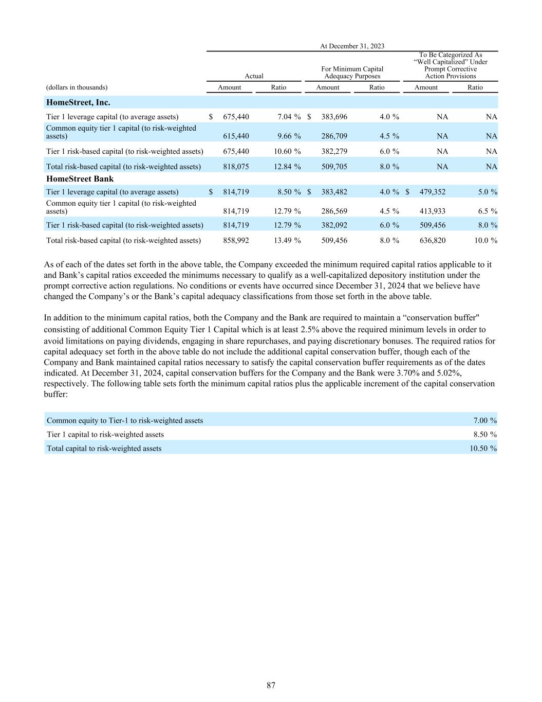 截至2023年12月31日,根据及时纠正措施条款被归类为“资本充足”的最低资本充足用途的实际(单位:千美元)金额比率金额比率金额比率金额比率HomeStreet,Inc.一级杠杆资本(与平均资产)$ 675,4407.04% $ 383,6964.0% NA NA普通股权一级资本(与风险加权资产)615,4409.66% 286,7094.5% NA NA一级风险资本(与风险加权资产)675,44010.60% 382,2796.0% NA NA总风险资本(与风险加权资产)818,07512.84% 509,7058.0% NA NA HomeStreet银行一级杠杆资本(与平均资产)814,7198.50% $ 383,4824.0% $ 479,3525.0%普通股权一级资本(与风险加权资产)814,71912.79% 286,5694.5% 413,9336.5%一级风险资本(与风险加权资产相比)814,71912.79% 382,0926.0% 509,4568.0%风险资本总额(与风险加权资产相比)858,99213.49% 509,4568.0% 636,8201.0%截至上表所列各日期,公司均超过了适用于其的最低要求资本比率,且银行的资本比率超过了根据及时纠正措施规定具备资本充足的存款机构资格所需的最低限度。自2024年12月31日以来,我们认为没有发生任何条件或事件改变公司或银行的资本充足分类与上表所列的条件或事件。除了最低资本比率外,公司和银行都被要求维持一个“保护缓冲”,包括额外的普通股一级资本,该资本至少比规定的最低水平高出2.5%,以避免在支付股息、从事股票回购和支付酌情奖金方面受到限制。上表所列的资本充足所需比率不包括额外的资本节约缓冲,尽管截至所示日期,公司和银行各自维持了满足资本节约缓冲要求所需的资本比率。于2024年12月31日,公司及本行的资本节约缓冲分别为3.70%及5.02%。下表列出了最低资本比率加上资本节约缓冲的适用增量:普通股比Tier-1对风险加权资产7.00%一级资本对风险加权资产8.50%总资本对风险加权资产10.50% 87