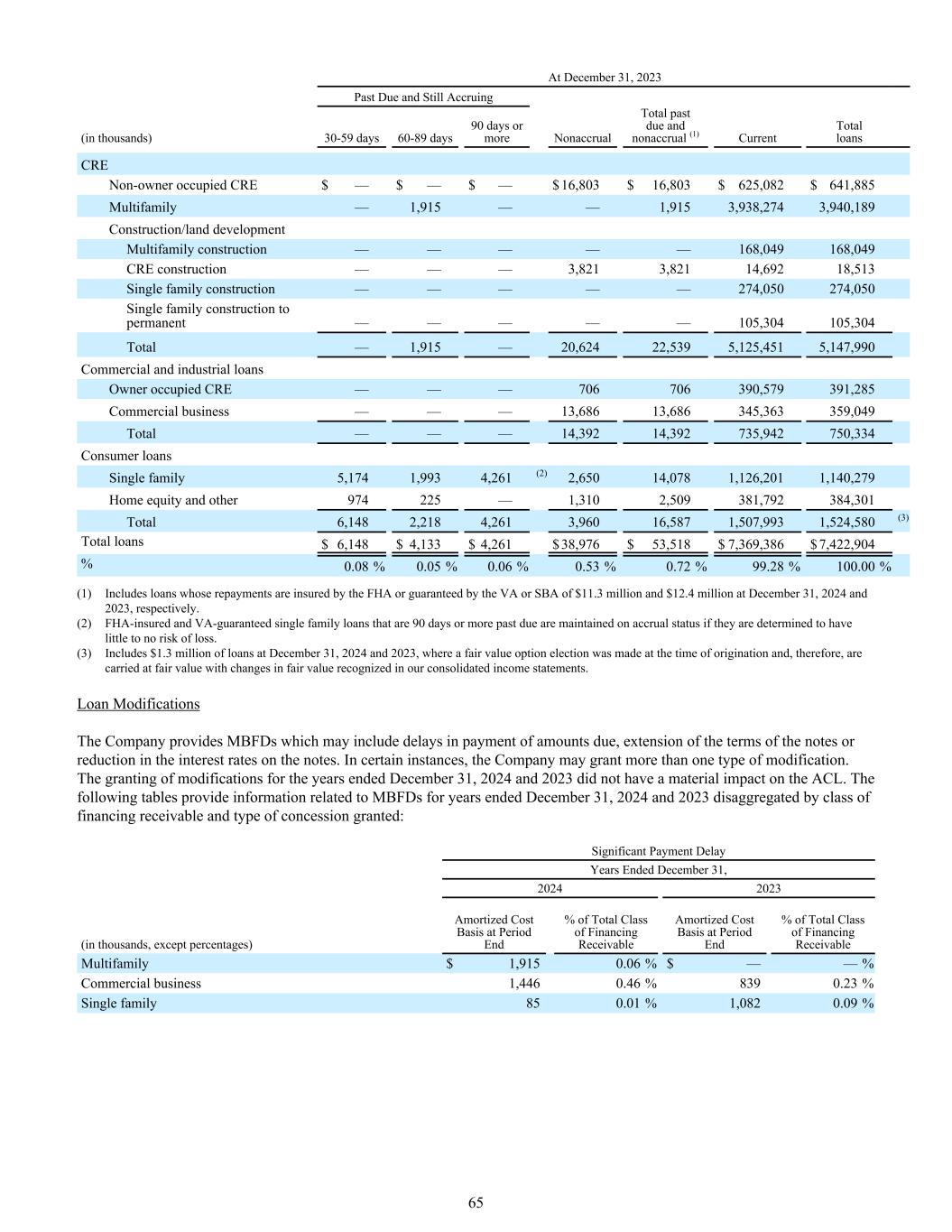 12月31日,2023年逾期仍应计(千)30-59天60-89天90天以上非应计逾期总额和非应计(1)当前贷款总额CRE非业主占用CRE $ — $ — $ — 16,803 $ 16,803 $ 625,082 $ 641,885多户— 1,915 —— 1,9153,938,2743,940,189建筑/土地开发多户建筑———— 168,049168,049 CRE建筑———— 3,8213,82114,69218,513单户建筑———— 274,050274,050单户建筑至永久———— 105,304105,304合计—— 1,915 — 20,62422,5395,125,4515,147,990商业和工业贷款业主占用CRE ———— 706706390,579391,285商业业务———— 13,68613,686345,363359,049合计———— 14,39214,392735,942750,334消费贷款单一家庭5,1741,9934,261(2)2,65014,0781,126,201,140,279房屋净值及其他974225 — 1,3102,509381,792384,301合计6,1482,2184,2613,960166,5871,507,9931,524,580(3)贷款总额$ 6,148 $ 4,133 $ 4,261 $ 38,976 $ 53,518 $ 7,369,386 $ 7,422,904% 0.08% 0.05% 0.06% 0.53% 0.72% 99.28% 100.00%(1)包括在2024年12月31日和2023年12月31日由联邦住房管理局投保或由VA或SBA担保的还款分别为1130万美元和1240万美元的贷款。(2)逾期90天或更长时间的FHA保险和VA担保的单户贷款,如果确定几乎没有损失风险,则保持应计状态。(3)包括2024年12月31日和2023年12月31日的130万美元贷款,其中在发起时进行了公允价值选择,因此以公允价值列账,公允价值变动在我们的综合损益表中确认。贷款修改公司提供MBFD,可能包括延迟支付到期金额、延长票据条款或降低票据利率。在某些情况下,公司可能会授予不止一种类型的修改。授予截至2024年12月31日和2023年12月31日止年度的修改对ACL没有实质性影响。下表提供了按应收融资类别和授予特许权类型分列的截至2024年12月31日和2023年12月31日止年度的MBFD相关信息:截至2024年12月31日的重大付款延迟年度2023年(以千为单位,百分比除外)期末摊余成本基础占应收融资类别总额的百分比期末摊余成本基础占应收融资类别总额的百分比1,9150.06% $ ——%商业业务1,4460.46% 8390.23%单一家庭850.01% 1,0820.09% 65