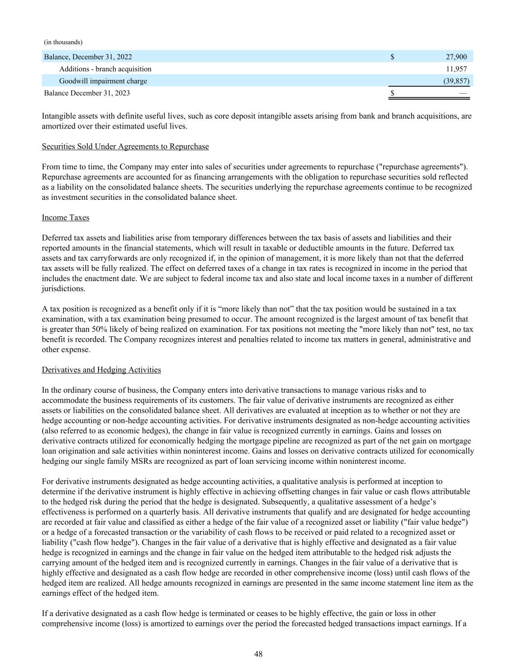 (单位:千)余额,2022年12月31日27,900美元增加-分支机构收购11,957商誉减值费用(39,857)余额2023年12月31日$ —具有确定使用寿命的无形资产,如银行和分支机构收购产生的核心存款无形资产,按其估计使用寿命摊销。不时根据约定购回出售的证券,公司可能会根据约定购回(“购回协议”)订立销售证券。回购协议作为融资安排入账,回购卖出证券的义务在综合资产负债表上反映为负债。回购协议的基础证券继续在合并资产负债表中确认为投资证券。所得税递延所得税资产和负债产生于资产和负债的计税基础与其在财务报表中列报金额之间的暂时性差异,这将导致未来的应课税或可抵扣金额。递延所得税资产和税收结转只有在管理层认为递延所得税资产完全变现的可能性较大时才予以确认。税率变动对递延税项的影响在包括颁布日期的期间内确认为收入。我们需要缴纳联邦所得税,还需要缴纳多个不同司法管辖区的州和地方所得税。只有当税务状况“更有可能”在税务审查中得到维持,并假定发生税务审查时,税务状况才被确认为一种好处。确认的金额是在考试时实现的可能性大于50%的最大税收优惠金额。对于未满足“可能性大于不满足”测试的纳税岗位,不记录纳税优惠。公司在一般、行政和其他费用中确认与所得税事项相关的利息和罚款。衍生工具及套期保值活动在日常业务过程中,公司进行衍生工具交易是为了管理各种风险并适应客户的业务需求。衍生工具的公允价值在综合资产负债表上确认为资产或负债。所有衍生工具都在开始时进行评估,以确定它们是否属于套期会计或非套期会计活动。对于指定为非套期会计活动(也称为经济套期)的衍生工具,公允价值的变动当期在收益中确认。用于对抵押贷款管道进行经济对冲的衍生合同的收益和损失在非利息收入中确认为抵押贷款发起和销售活动净收益的一部分。用于对我们的单一家庭MSR进行经济对冲的衍生合约的损益在非利息收入中确认为贷款服务收入的一部分。对于指定为套期会计活动的衍生工具,在开始时进行定性分析,以确定衍生工具在指定套期期间是否高度有效地实现了抵消被套期风险应占公允价值或现金流量的变动。随后,每季度对套期保值的有效性进行定性评估。符合条件并被指定用于套期会计的所有衍生工具均按公允价值入账,并分类为对已确认资产或负债的公允价值进行套期(“公允价值套期”)或对预测交易进行套期或与已确认资产或负债相关的将收到或支付的现金流量的可变性(“现金流量套期”)。有效性高、被指定为公允价值套期的衍生工具的公允价值变动计入收益,被套期项目因被套期风险引起的公允价值变动调整被套期项目的账面价值,当期计入收益。高度有效并被指定为现金流量套期的衍生工具的公允价值变动计入其他综合收益(亏损),直至被套期项目的现金流量实现。在收益中确认的所有套期保值金额与被套期项目的收益影响在同一损益表项目中列报。指定为现金流量套期的衍生工具终止或不再高度有效的,其他综合收益(损失)中的利得或损失在预测的被套期交易影响收益的期间内摊销至收益。如果一个48