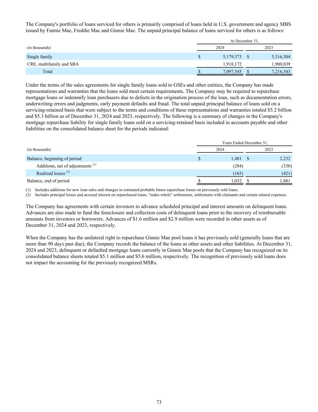 该公司为他人提供服务的贷款组合主要由房利美、房地美和金妮美发行的美国政府和机构MBS中持有的贷款组成。为他人提供服务的贷款未付本金余额如下:截至12月31日,(单位:千)20242023单一家庭5,179,373美元5,316,304美元CRE、多家庭和SBA 1,918,1721,900,039美元总计7,097,545美元7,216,343美元根据出售给GSE和其他实体的单一家庭贷款的销售协议条款,公司已作出陈述和保证,出售的贷款符合某些要求。由于贷款发起过程中的缺陷,例如文件错误、承保错误和判断、提前付款违约和欺诈,公司可能被要求回购抵押贷款或赔偿贷款购买者。截至2024年12月31日和2023年12月31日,在服务-保留基础上出售的受这些陈述和保证的条款和条件约束的贷款的未付本金余额总额分别为52亿美元和53亿美元。以下是所示期间公司在合并资产负债表上计入应付账款和其他负债的按服务-保留基础出售的单一家庭贷款的抵押回购负债的变化摘要:截至12月31日的年度,(单位:千)20242023余额,期初$ 1,481 $ 2,232增加,扣除调整(1)(284)(330)已实现损失(2)(165)(421)余额,期末$ 1,032 $ 1,481(1)包括新贷款销售的增加和先前出售贷款的估计可能的未来回购损失的变化。(2)包括回购贷款的本金损失和应计利息、“补足”和解、与索赔人的和解以及某些相关费用。该公司与某些投资者达成协议,就拖欠贷款的预定本金和利息金额进行垫付。在从投资者或借款人收回可偿还金额之前,还提供预付款以资助拖欠贷款的止赎和催收成本。截至2024年12月31日和2023年12月31日,在其他资产中分别记录了160万美元和290万美元的预付款。当公司拥有单方面回购其先前出售的Ginnie Mae池贷款(一般为逾期90天以上的贷款)的权利时,公司将贷款余额记录为其他资产和其他负债。截至2024年12月31日和2023年12月31日,公司已在其综合资产负债表上确认的Ginnie Mae池中目前的拖欠或违约抵押贷款总额分别为510万美元和560万美元。确认先前出售的贷款不影响对先前确认的MSR的会计处理。73